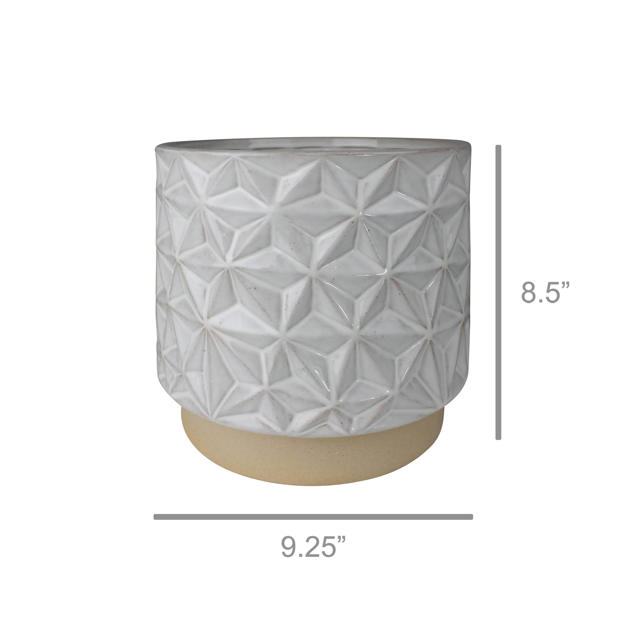 This stoneware cachepot with a hand sculpted pattern is glazed in white and sized to drop in a standard 2 gallon growers pot. Indoor gardening made easy!