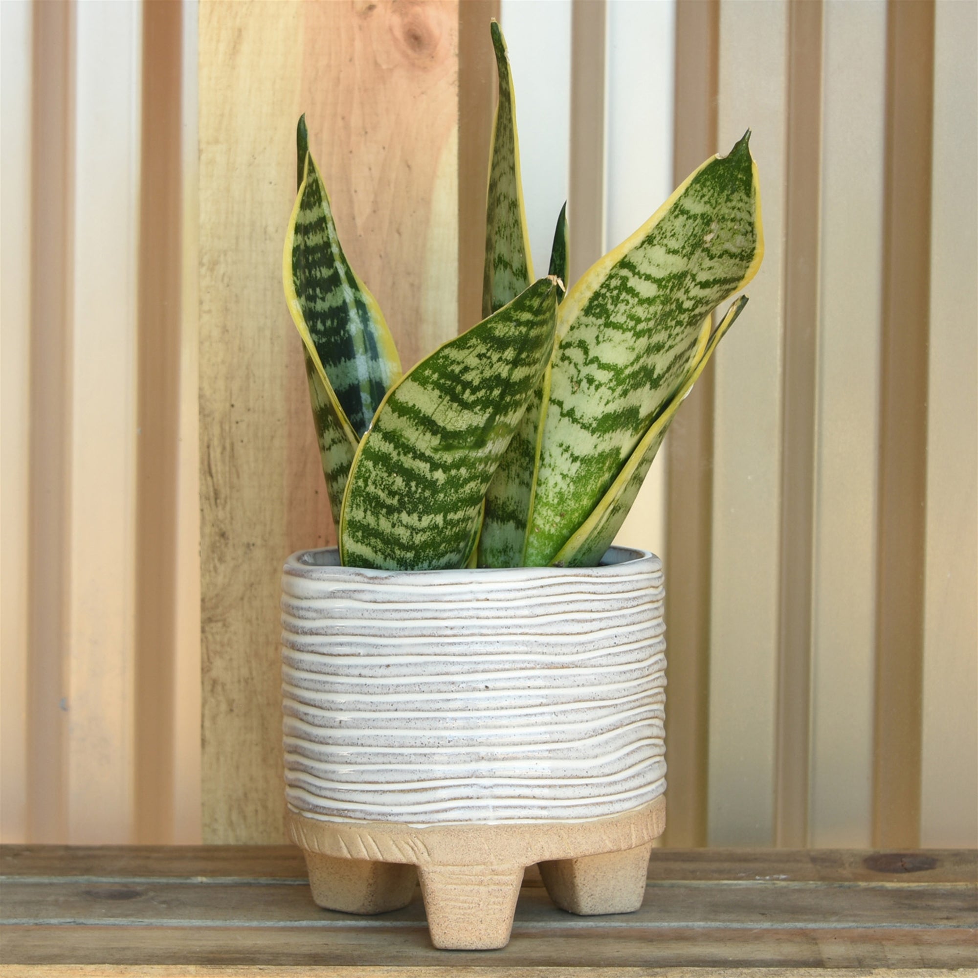 This stoneware cachepot with a hand sculpted pattern is glazed in white and sized to drop in a standard 4" growers pot. Indoor gardening made easy!