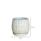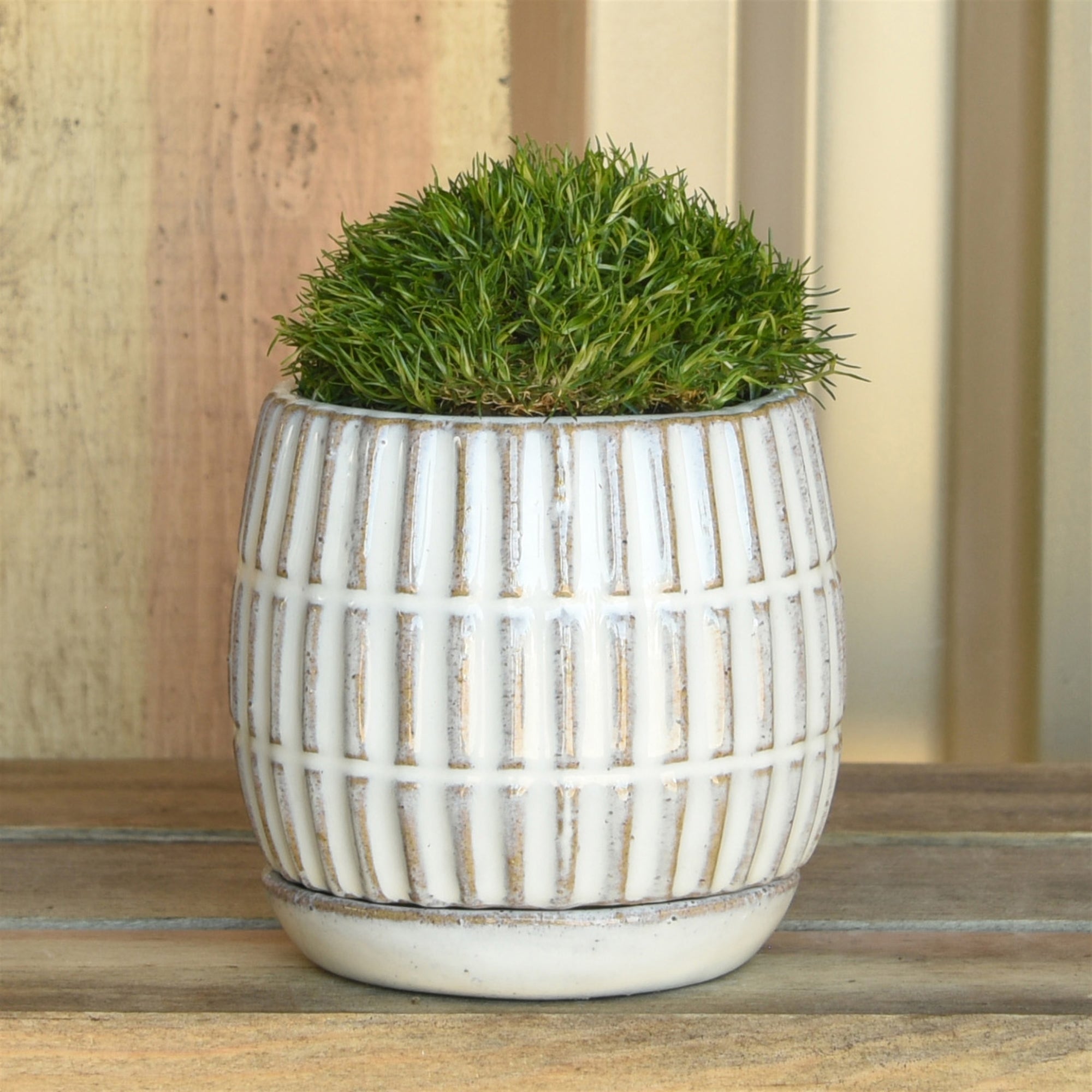 This stoneware cachepot with a hand sculpted pattern is glazed in white and sized to drop in a standard 2.5" growers pot. Indoor gardening made easy! This pot has a drainage hole and comes with a saucer.
