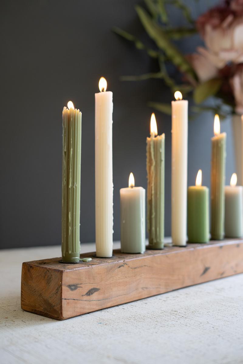 Use this candle display to represent the holidays or illuminate your table. Use this nine-taper holder for mixing and matching sizes or colors of candles. Light up any room with this recycled wood piece made in India.