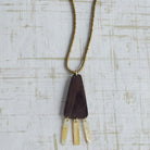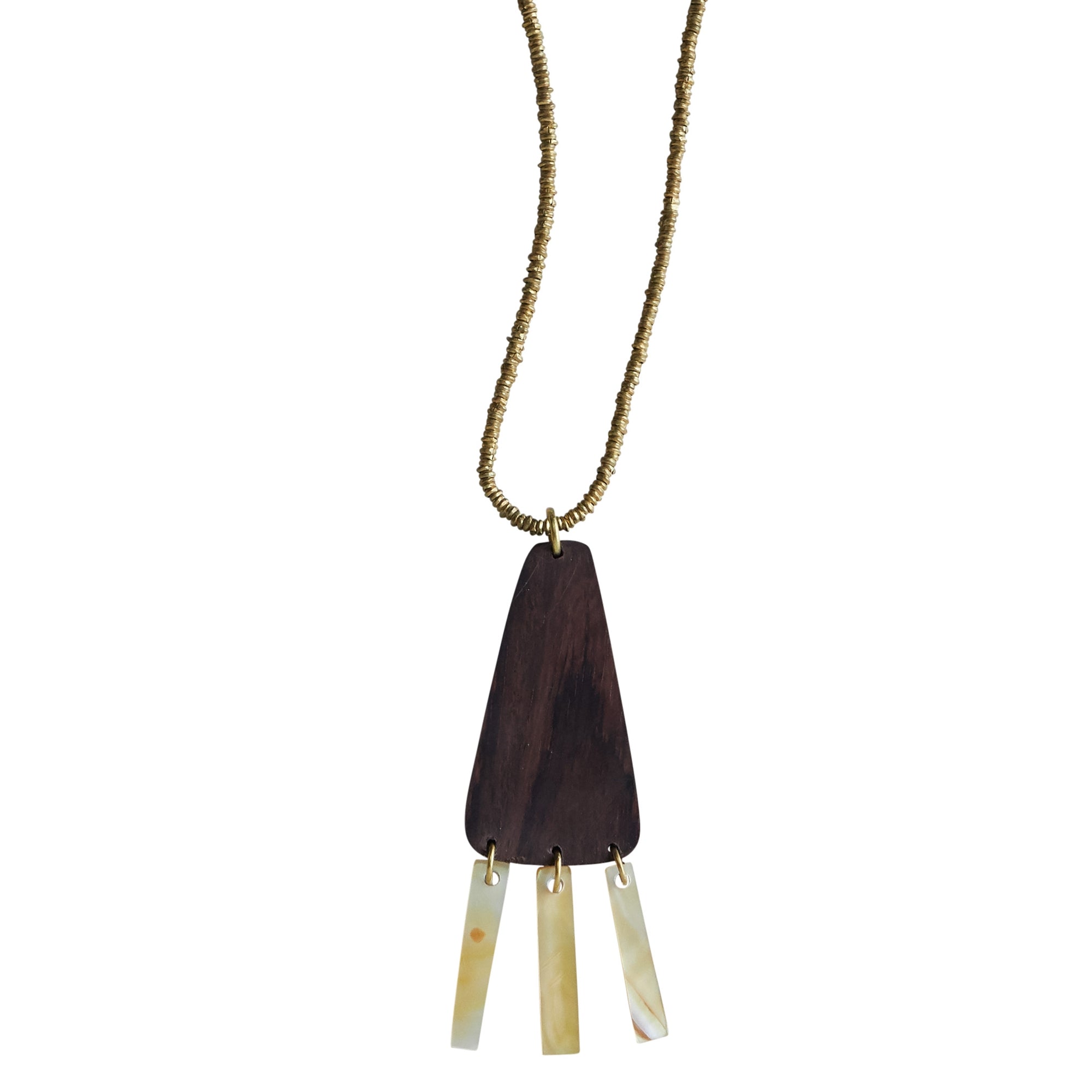 Tabs of Mother of Pearl shower down from wooden drops creating a duet of beautiful movement. Pendant features a soft, adjustable leather cord.