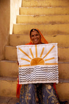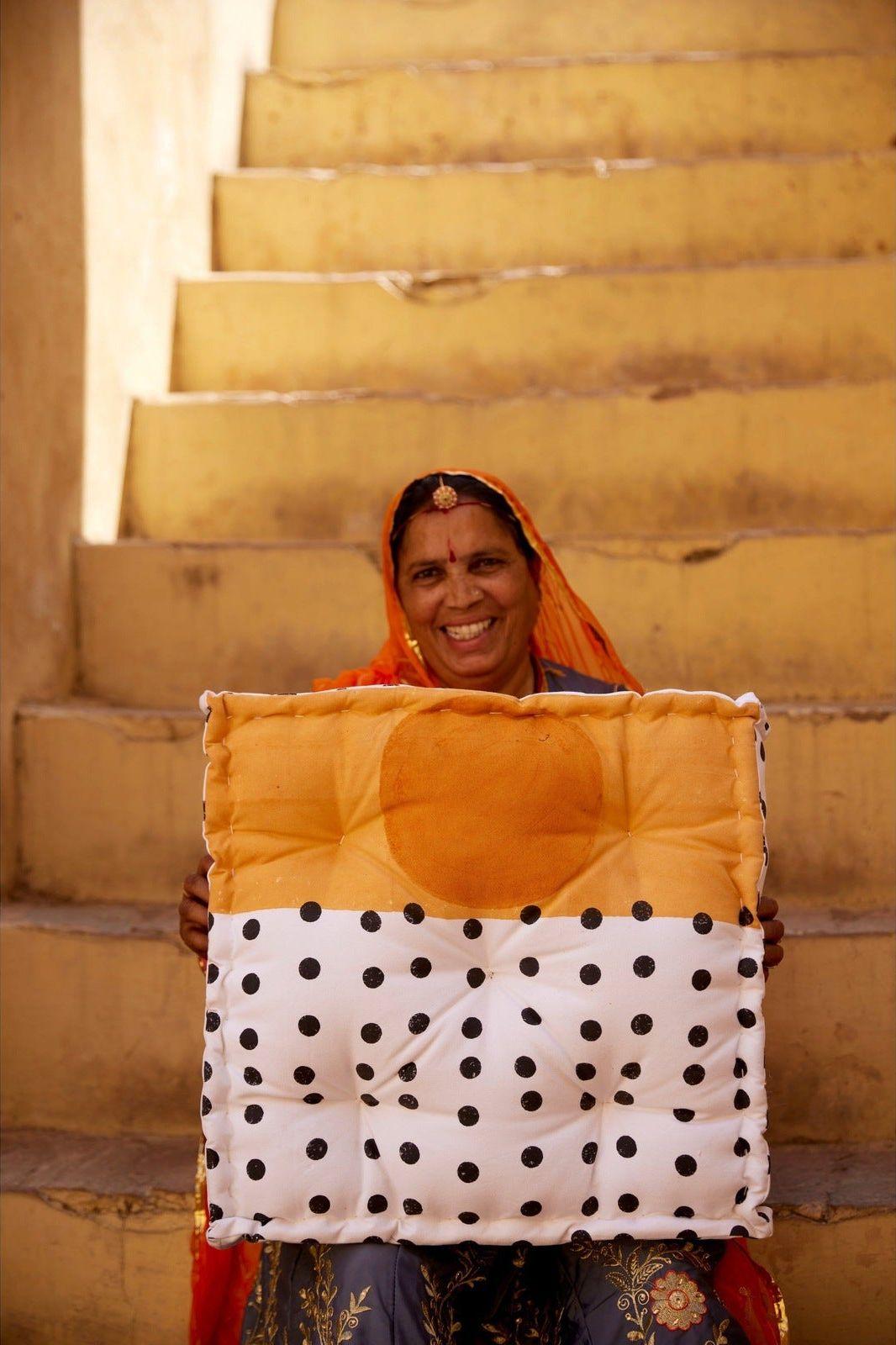 The cushion’s design is hand-pressed onto cotton using hand-carved wooden blocks dipped in dyes. The printed cotton shells are then brought to the homes of sewists who stuff and stitch the pillows by hand, creating the final product.