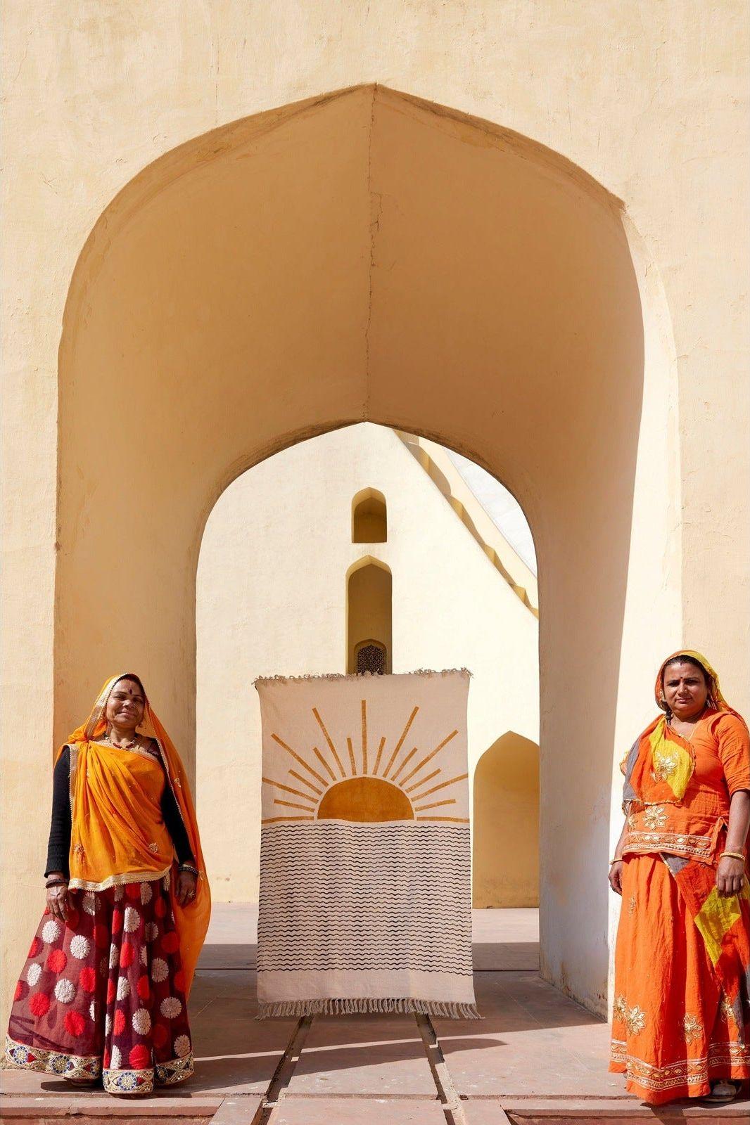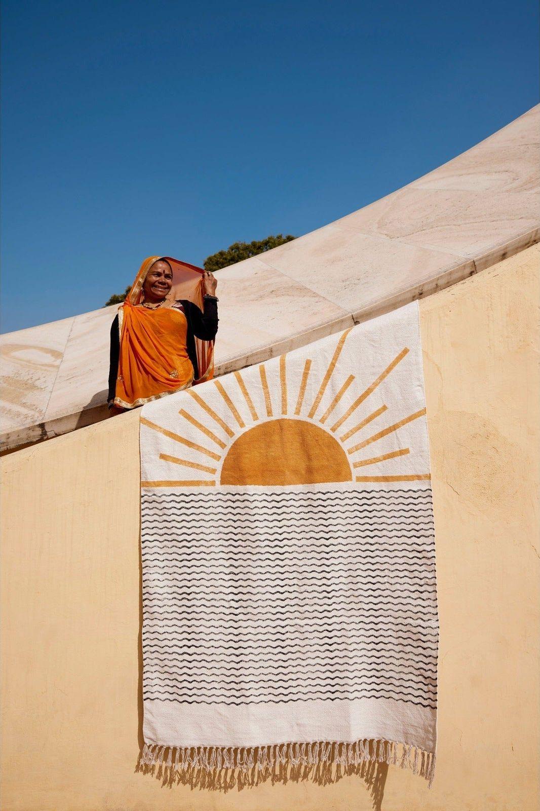Each rug is handmade, requiring attention from 4 artisans, including wood carvers, block printers, weavers, and dye specialists.