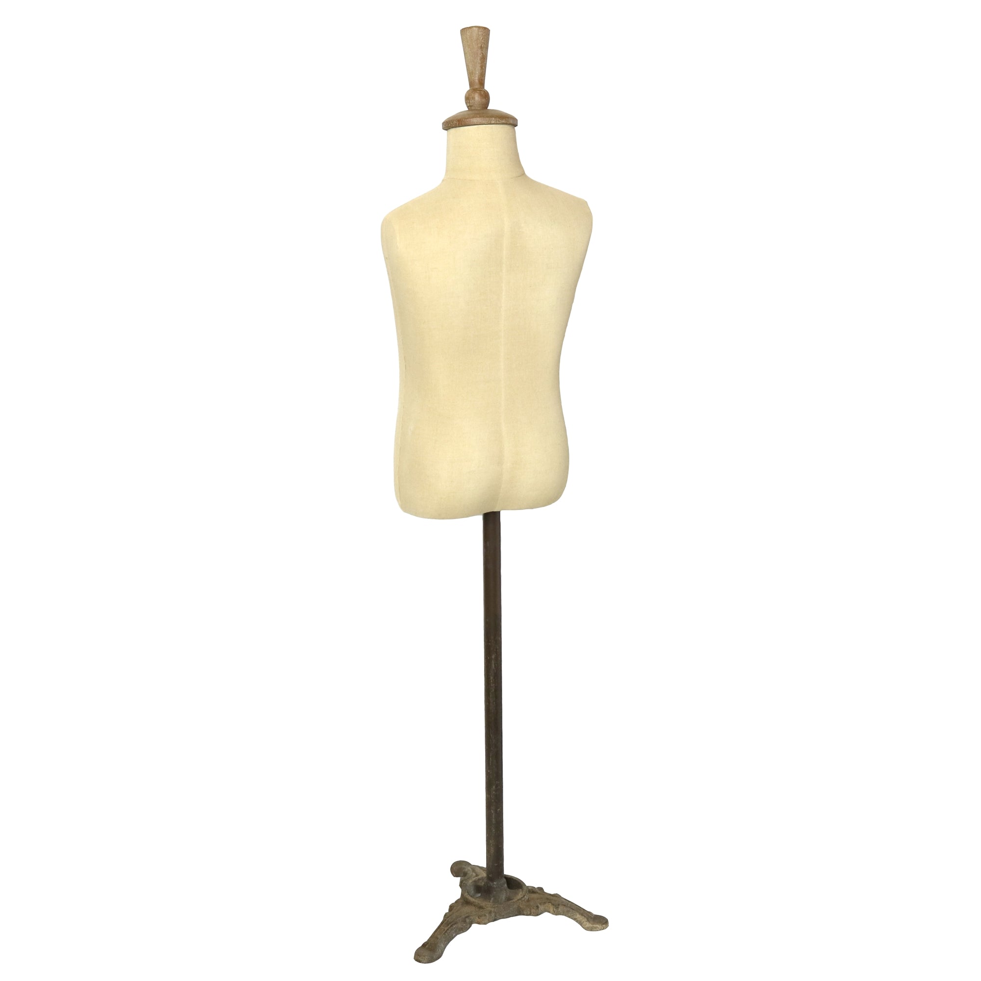 Inspired by vintage department store display pieces our Roebuck Mannequins feature a sturdy cast iron stand with adjustable height and a slightly distressed fabric bodice. Chest 27"