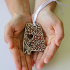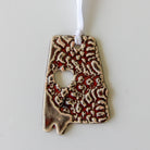 Roll Tide! These state ornaments feature Alabama colors and a cut-out heart at Tuscaloosa's location. They are perfect to hang on the Christmas tree, tie to a gift, or hang in your window. These precious, handmade ornaments are pressed with lace to create unique and beautiful patterns, and are sure to make you and your loved ones smile!