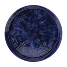 Bring elegance and versatility to your home with this round etched metal tray. Featuring a cool navy blue tone with a distressed painted design and glossy glazed finish, this tray adds a sophisticated yet rustic charm to any space. The modern textured starburst design creates a striking visual effect, making it the perfect piece for your coffee table or end table. Use it to display a set of vases, candles, or novelty décor, or fill it with fresh fruit or sweet treats when entertaining guests. Ideal for any décor style, this tray effortlessly combines form and function.