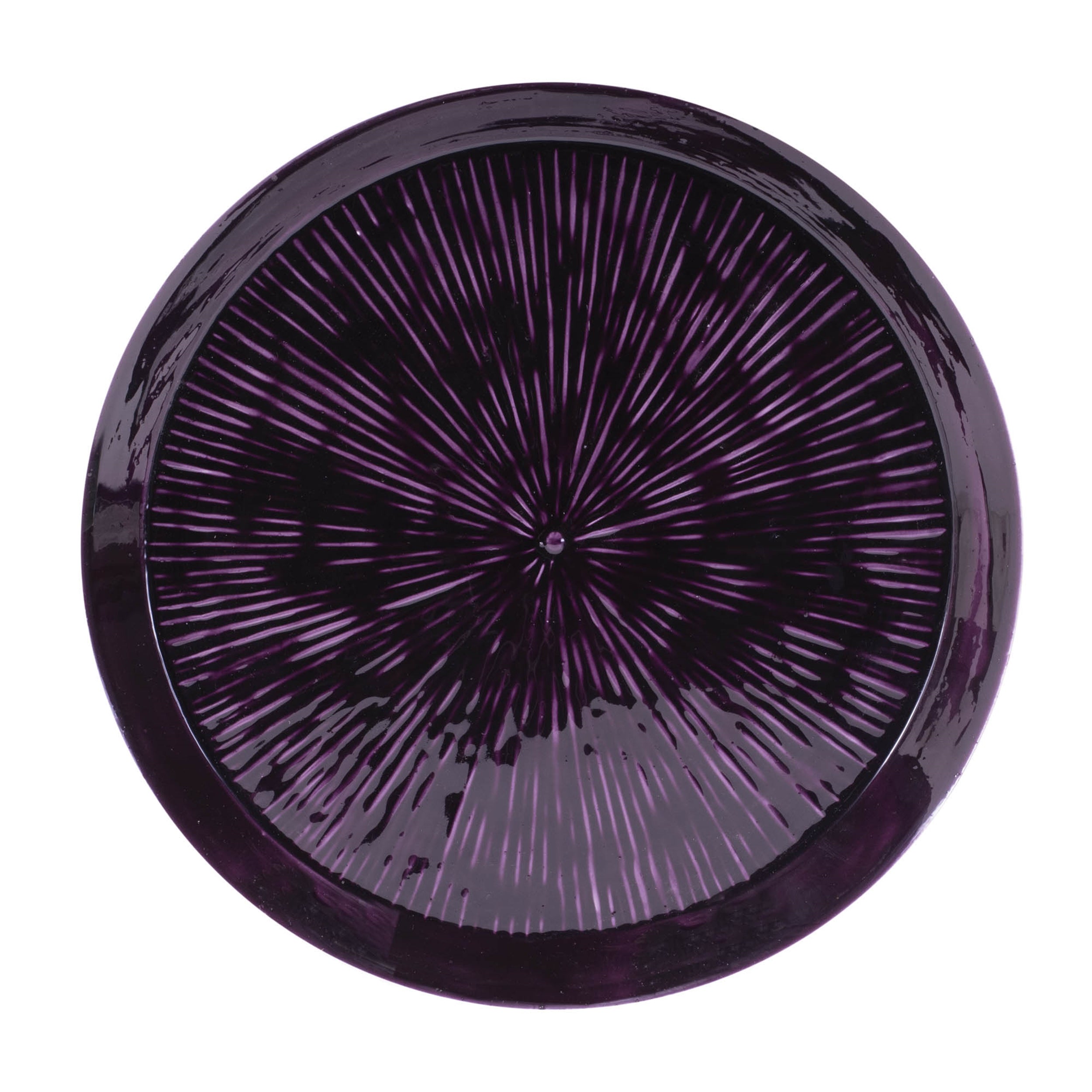 Add a bold splash of color and elegance to your space with this round etched metal tray. Featuring cool plum purple tones with a distressed painted design and glossy glazed finish, this tray brings a sophisticated yet vibrant touch to your home. The modern textured starburst design enhances its visual appeal, making it perfect for displaying on your coffee table or end table with vases, candles, or novelty décor. Alternatively, use it in your kitchen to showcase fresh fruit or sweet treats when entertaining guests. A versatile piece that complements any style of décor with its chic and eye-catching design.