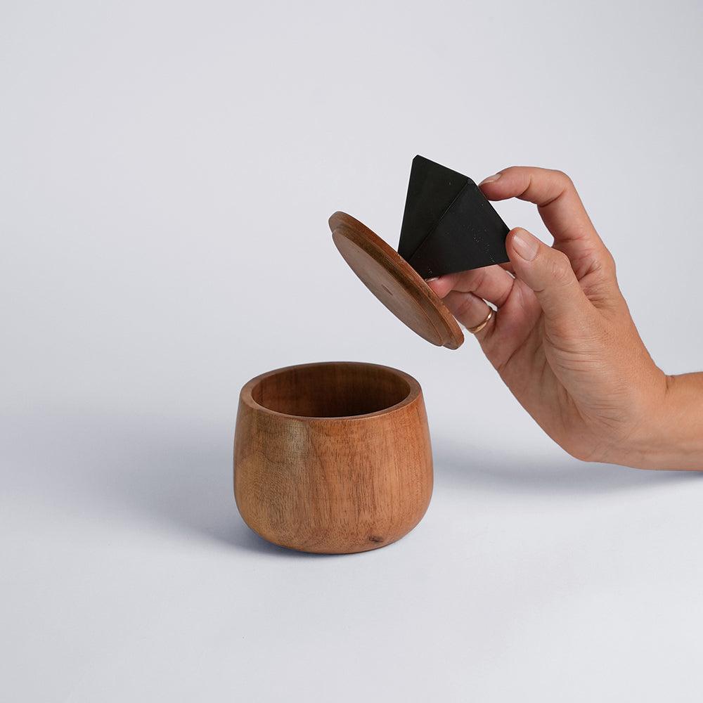 Contemporary round storage box carved from wood and black onyx gemstone. A dreamy accent for your nightstand, vanity or desk to hold jewels, q-tips, airpods and more. The round everything catchall box is a carved using traditional wood carpentry techniques in Magdalena de Cao, Perú. The pyramid-shaped gemstone handle is a geometric element that makes the moment of opening it up feel extra special.