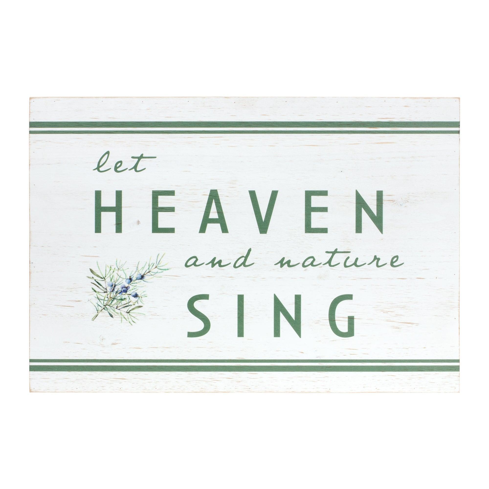 Welcome guests to your home in style with this beautiful Christmas Sign. Featuring the sentiment "Let Heaven and Nature Sing", the soft sage green sentiment and artwork paired with the weathered white finish is the perfect combination to create a stunning holiday display. The quality metal composition is sure to last for seasons to come. Display this piece in your entryway or living room to share the sentiment with your guests.