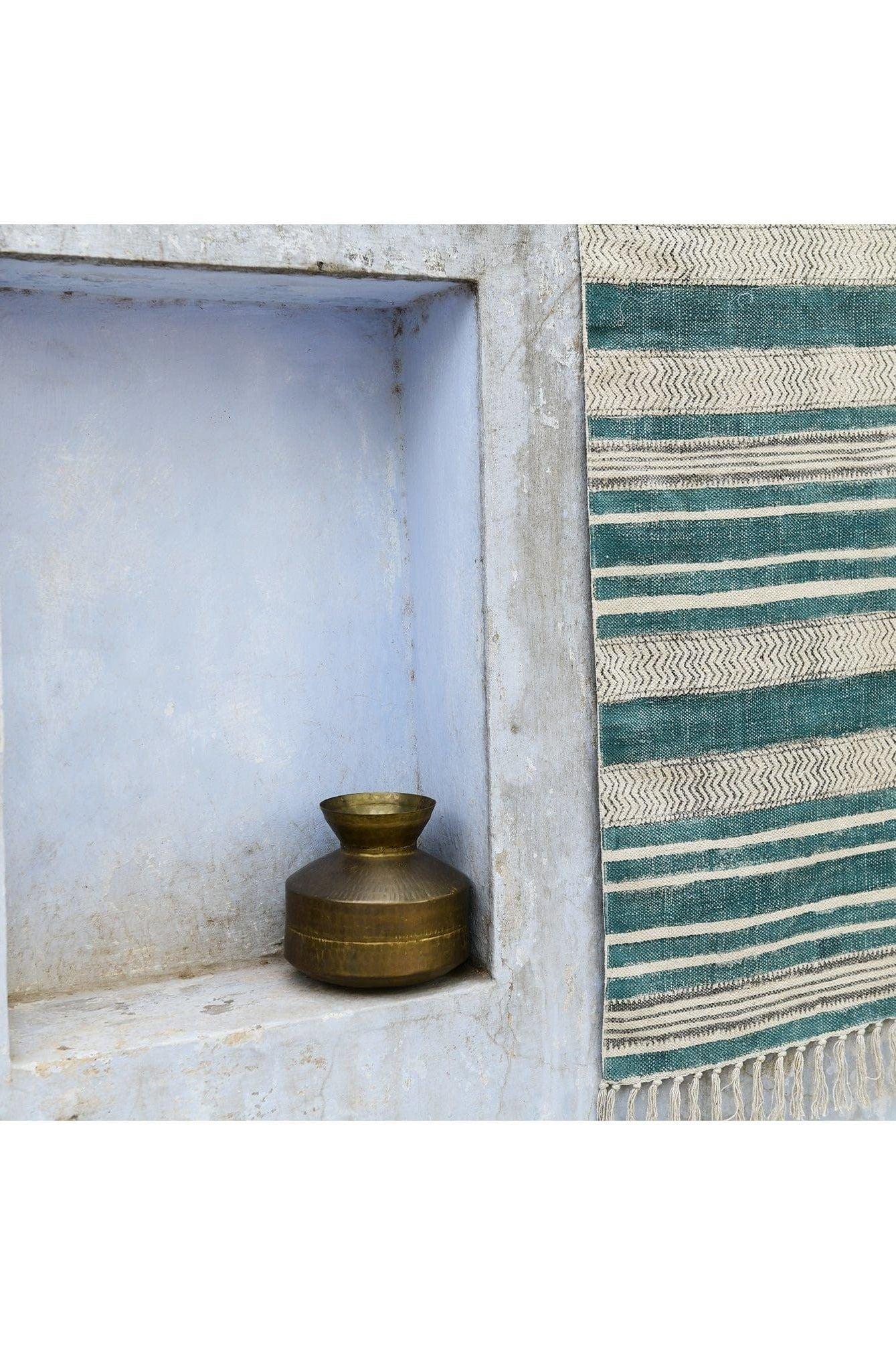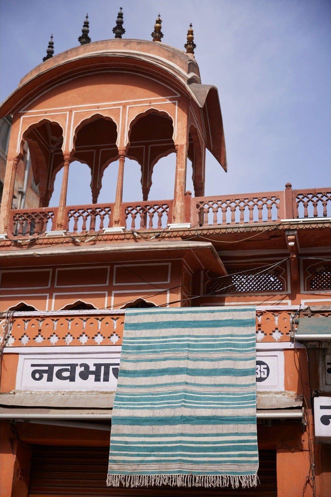 Each rug is handmade, requiring attention from 4 artisans, including wood carvers, block printers, weavers, and dye specialists.