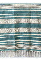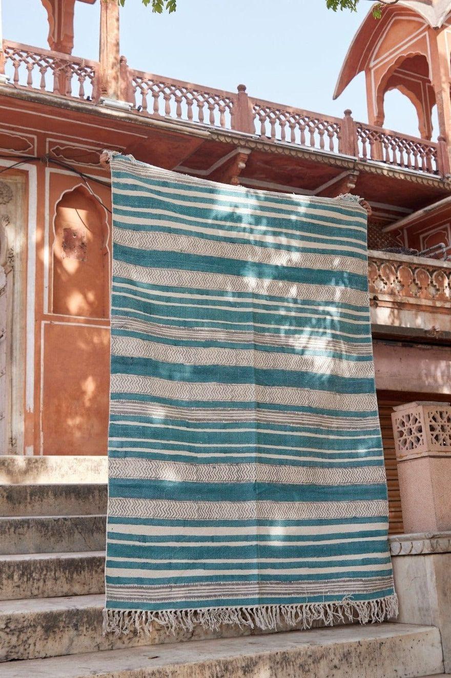 The design is hand-pressed onto each rug using hand-carved wooden blocks dipped in dyes. All rugs are made in small batches.