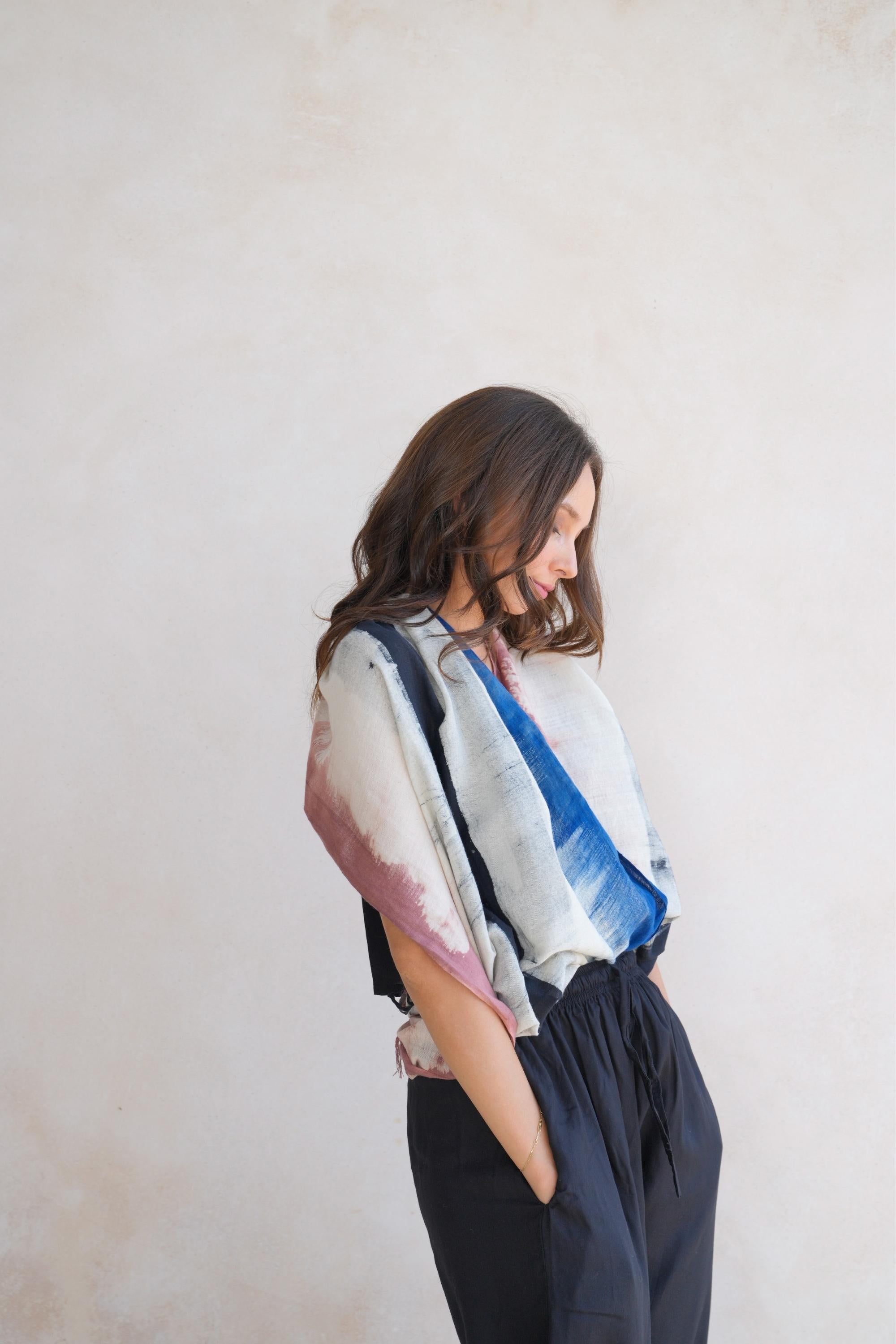 Look into the cottagecore style with this scarf in a bold hand dyed with fringe trimming at the ends.