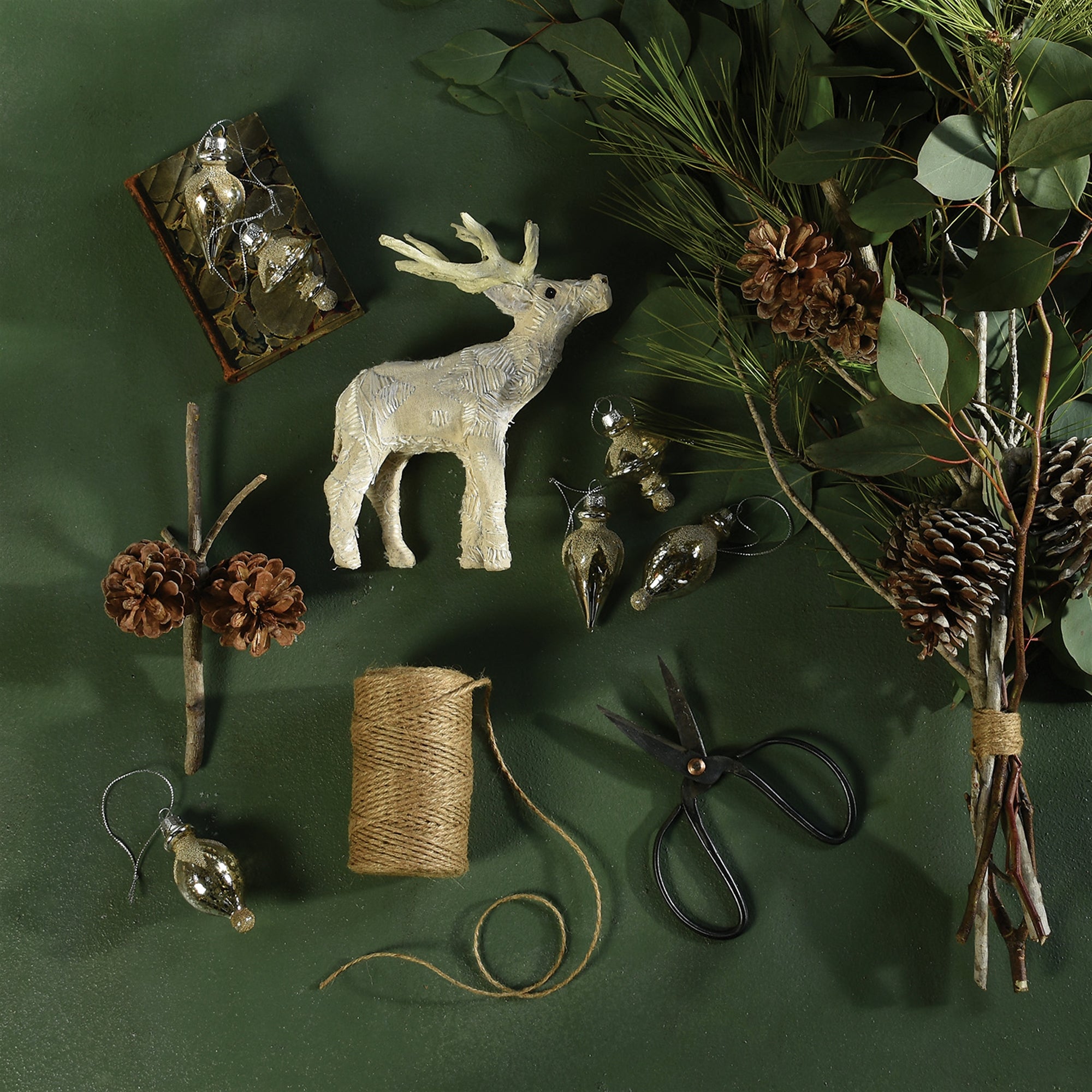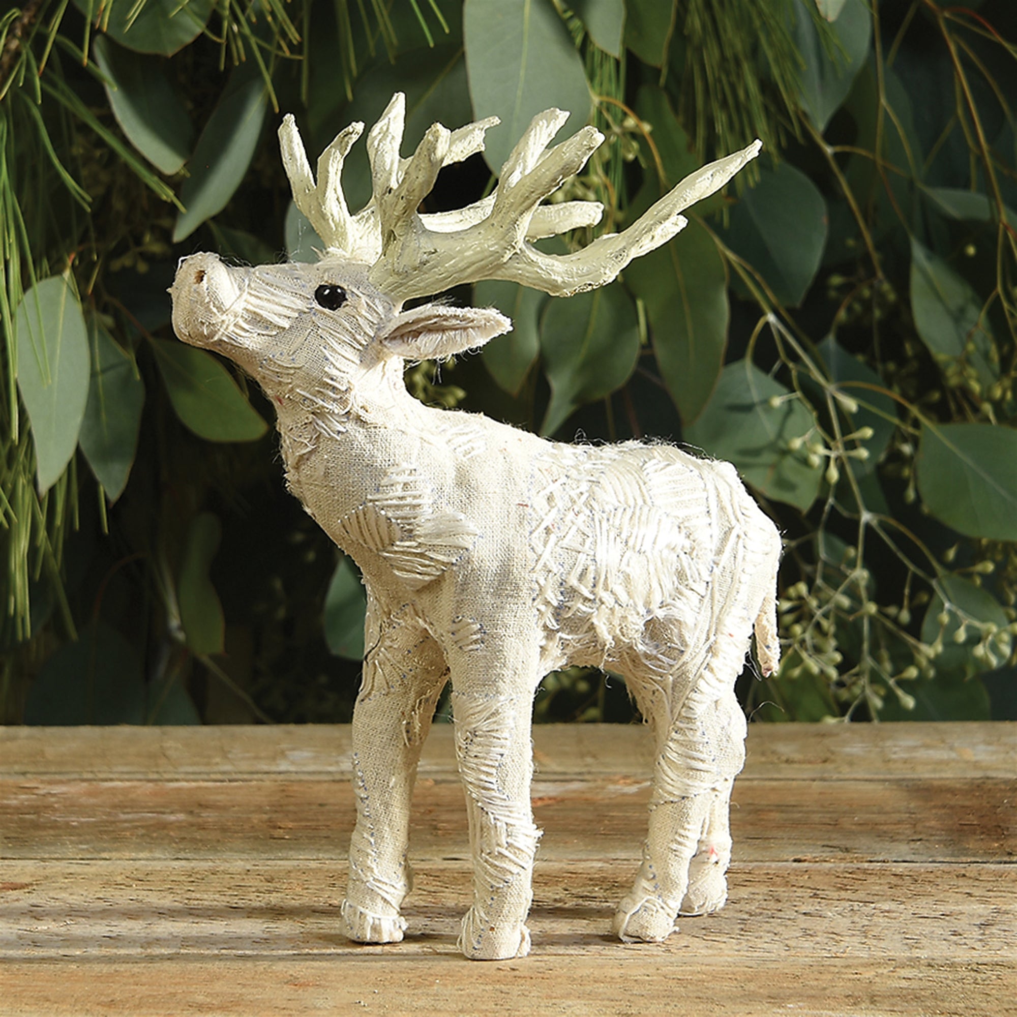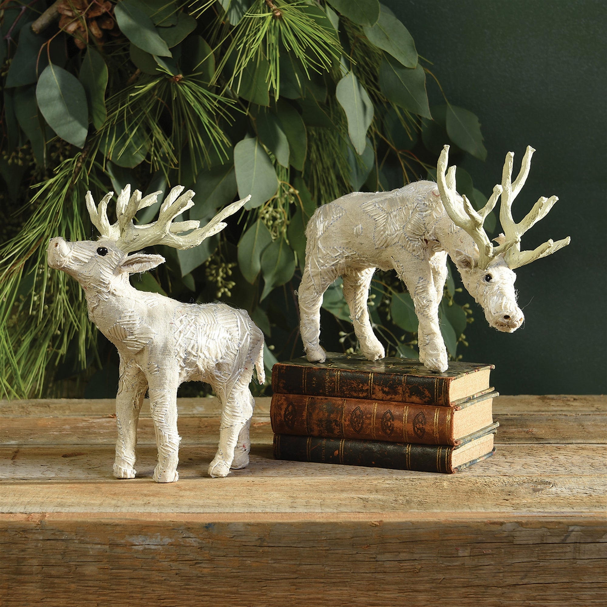 Natural fiber forms are wrapped in embroidered white fabric creating an ethereal heard of stags.