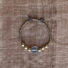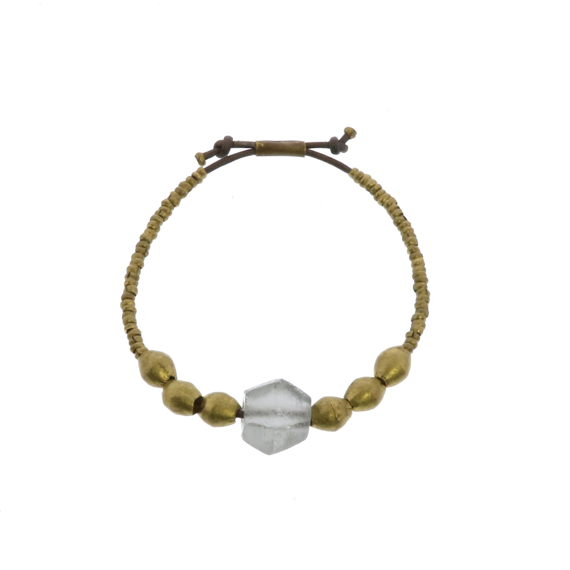 Matte, translucent seaglass beads are complimented perfectly by brass African beads in this layer-able and easy to wear collection. Adjustable soft leather cord. 3" diameter