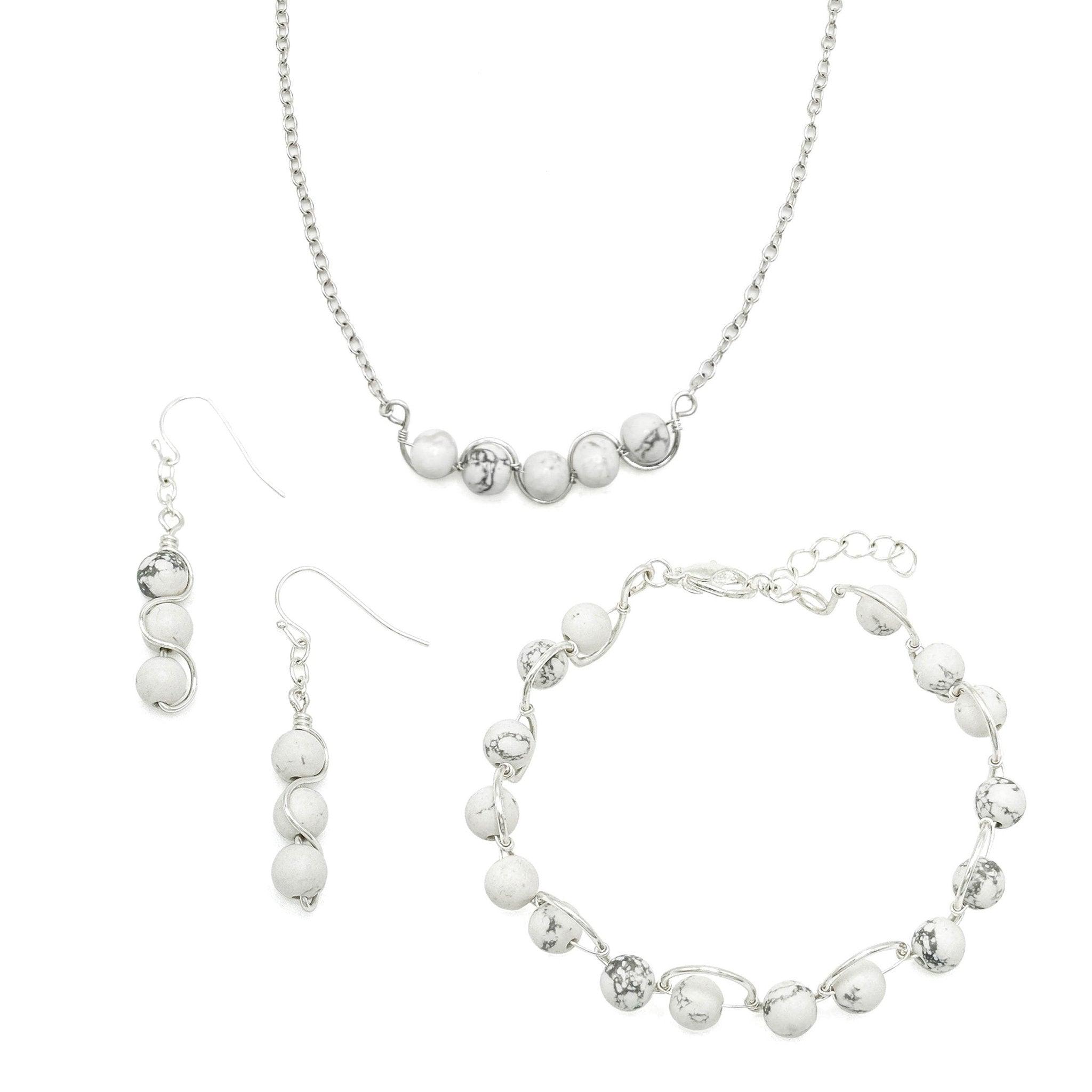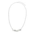 Making a simple statement with 5 white howlite stone beads elegantly wired onto a swooping silver wire bar. The 18 inch silver plated cable chain fastens with a lobster clasp and has a 3 inch extender for ultimate neckline versatility.
