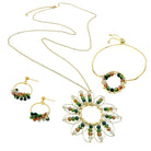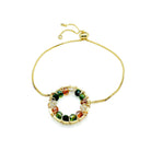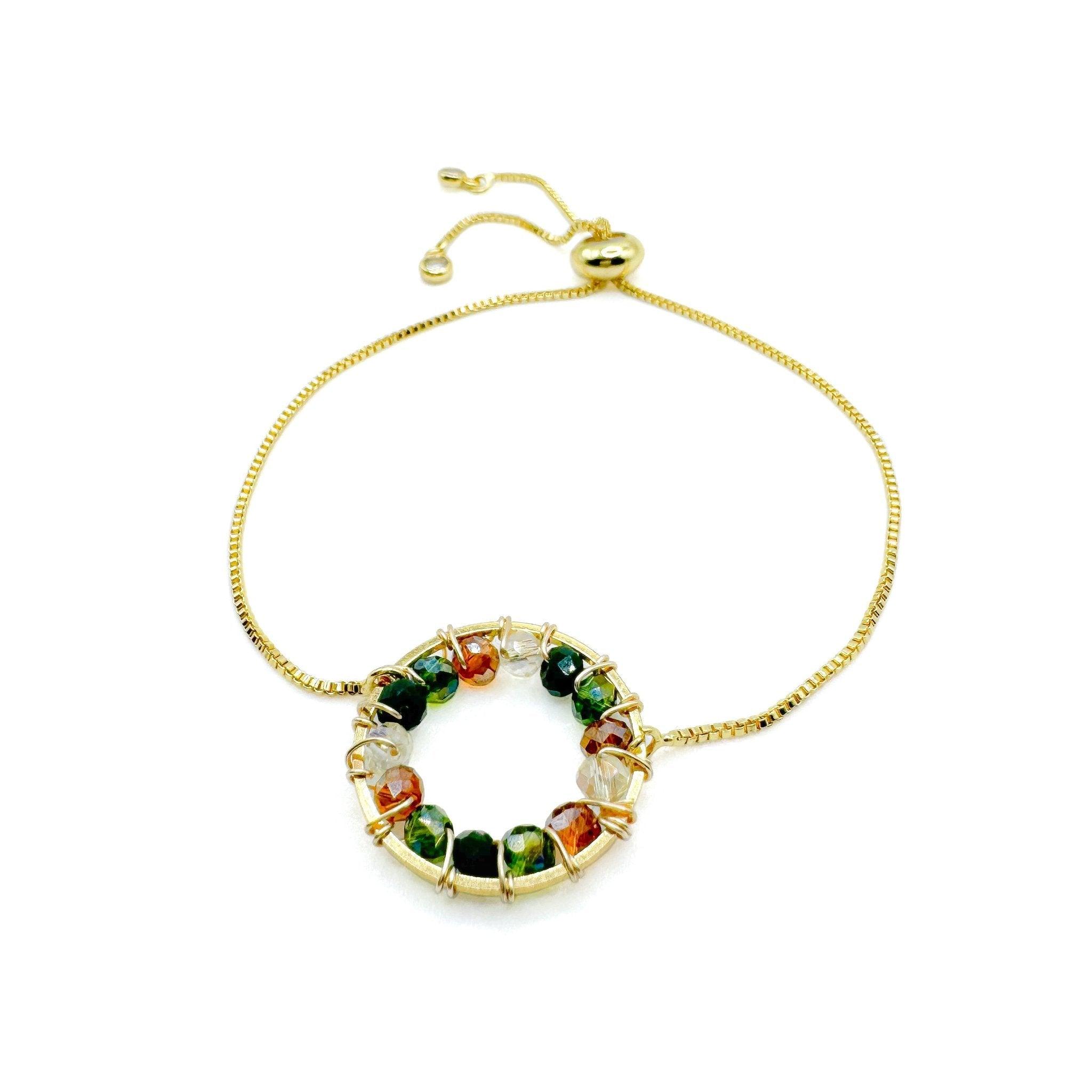Dainty and easy to wear, this gold filled adjustable slide bracelet boasts a hand-wired centerpiece of a gold circle encrusted with crystal in olive and emerald green, brown and clear.