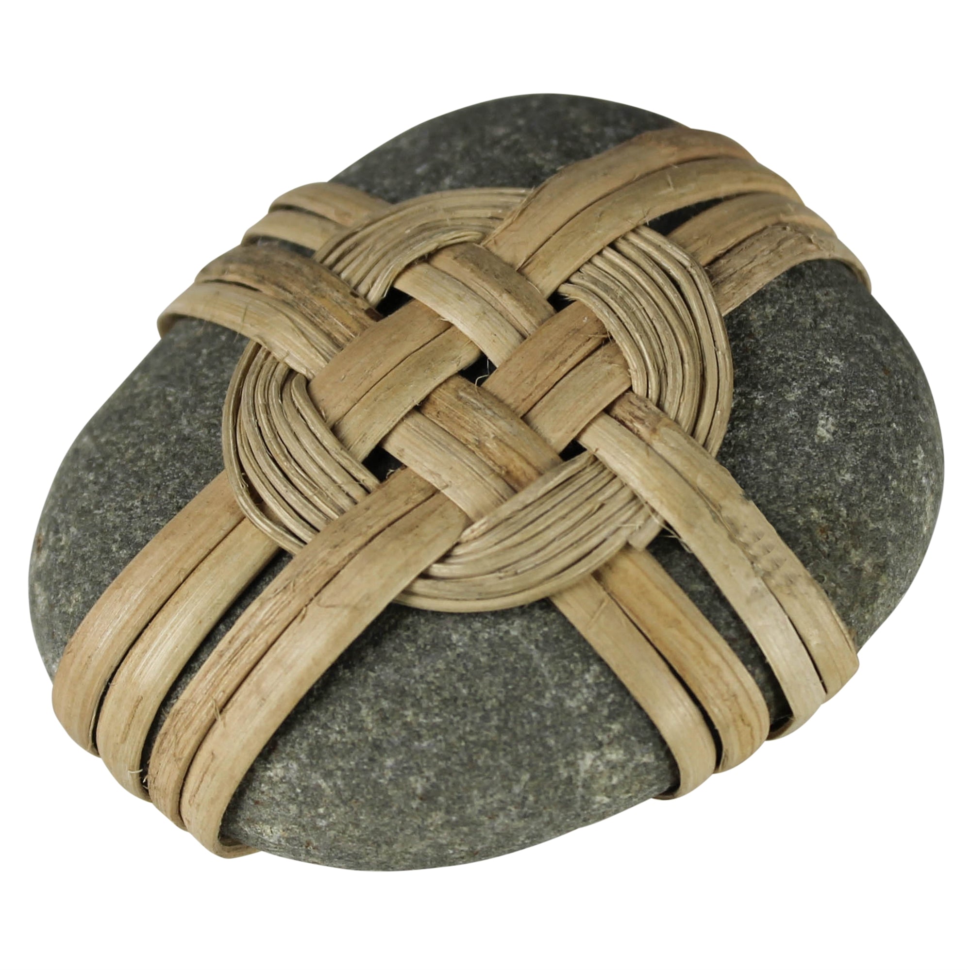 Natural stones are artfully wrapped in woven bamboo creating objects which feel as good in the hand as they look on a table. Each stone is natural so size, weight and color will vary. size will vary
