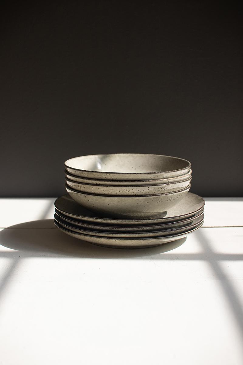 This set of twelve will gratify your guests and satisfy your sweetheart. These gorgeous oatmeal-colored dishes come in a set of one plate and one bowl. Vary your table with these perfectly imperfect dishes.
