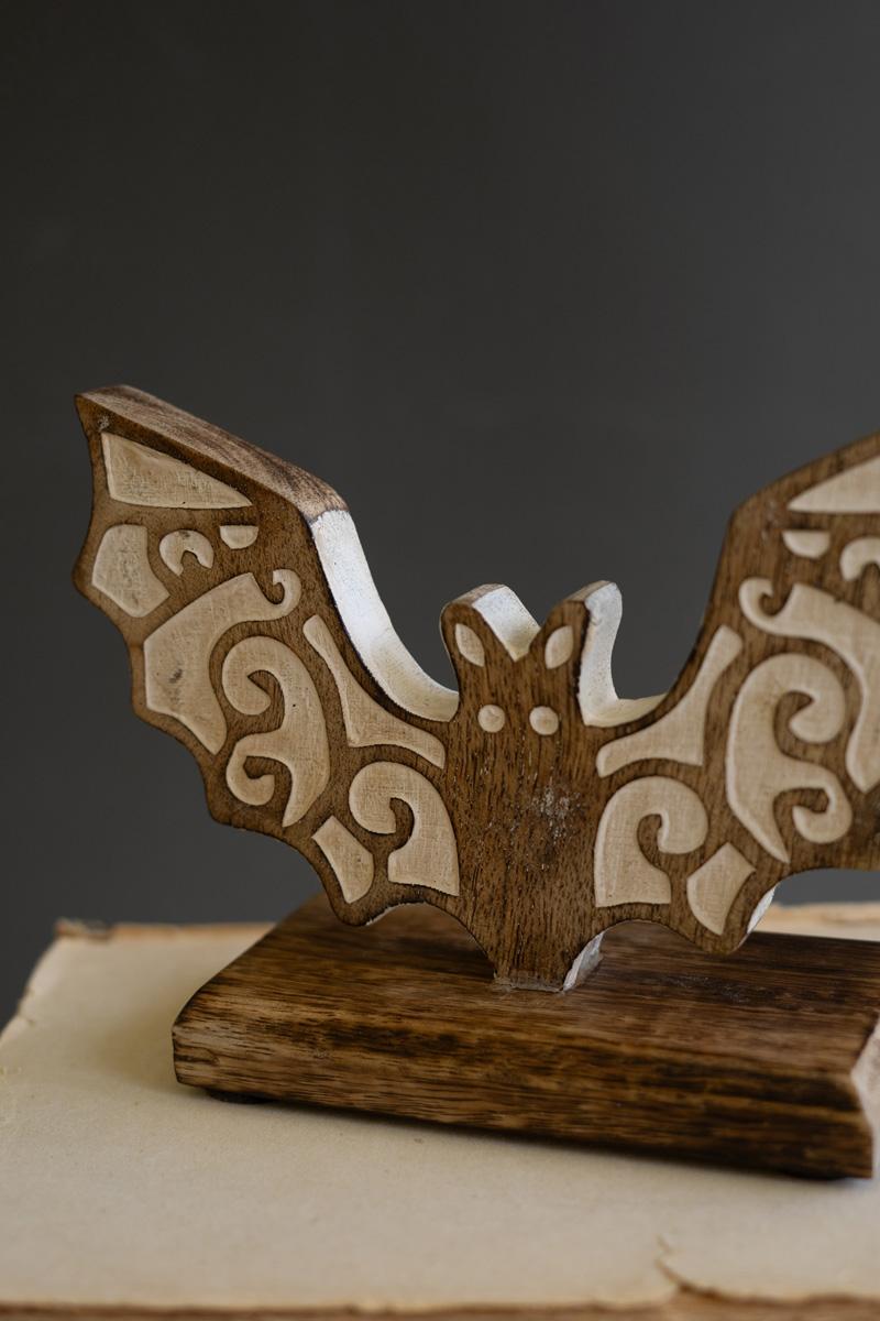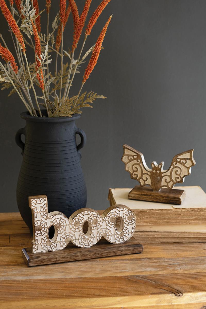 Set Of Two Carved Wooden Halloween Table Top Boo And Bat (Pack Of 2)