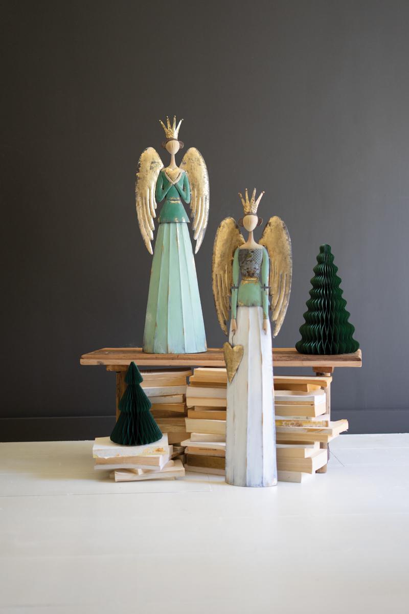 Hark! These crowned heavenly hosts in green and white, one with folded hands, the other holding a golden heart, make perfect holiday decor or a special gift. This pair of painted metal angels will watch over your entryway or keep Santa company.
