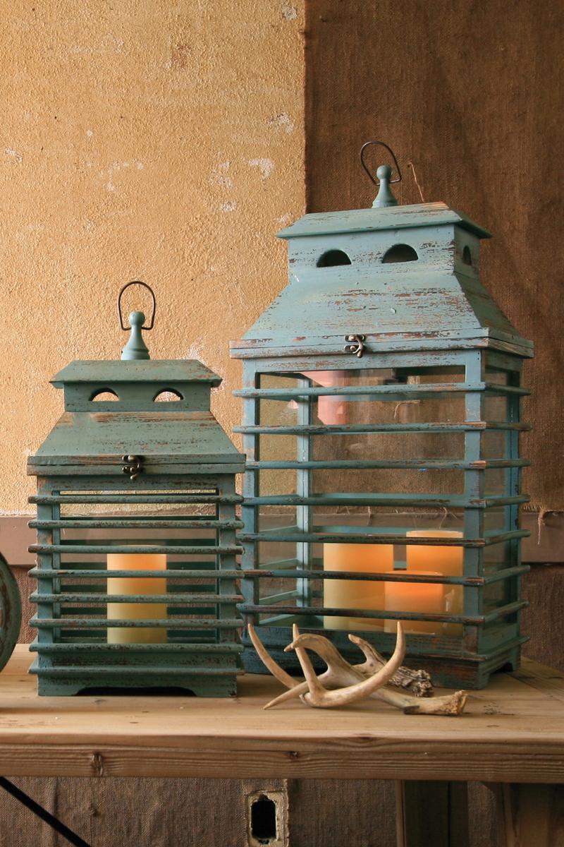 Set of Two Vintage Blue Shutter Lanterns can be placed together or on their own. Booth opening from the front with a metal latch. These Vintage Lanterns are cased with glass and have an opening at the top for any candle to breath.
