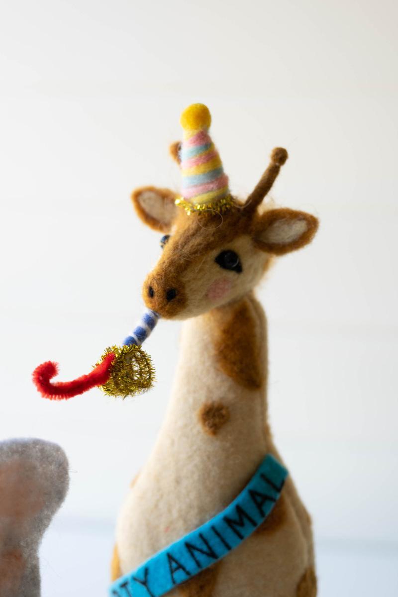 These felt party animals are ready to celebrate your next get-together. The set includes an elephant, giraffe, and zebra bottle topper in festive party dress. Each felt party animal is 5"x10"T.