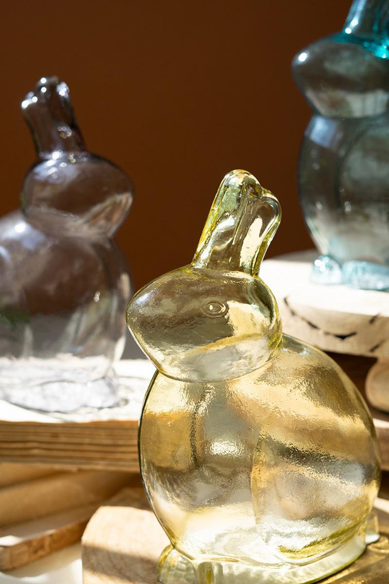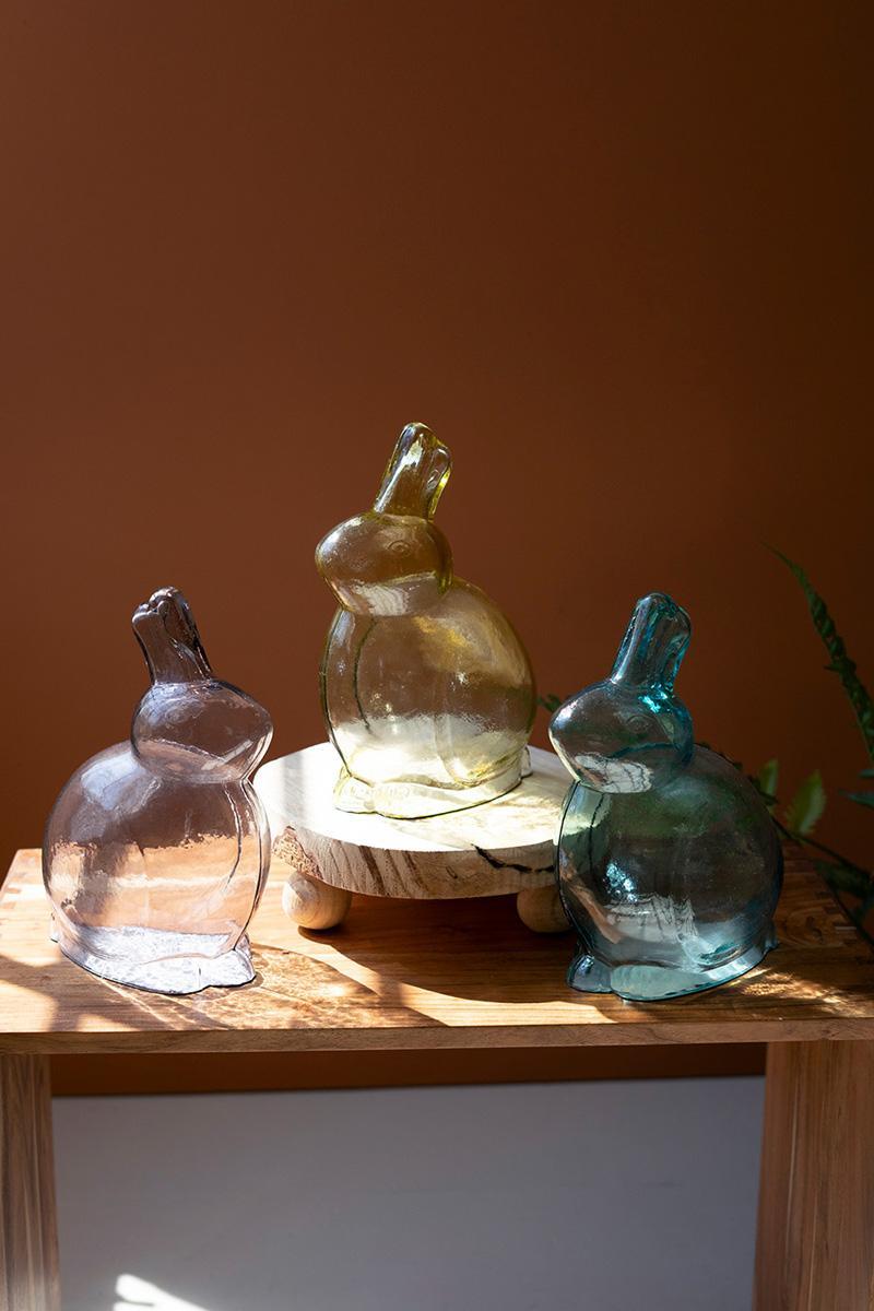 Set these glass rabbits up for a hoppin' Easter display or let them be gifts in the Bunny's baskets. This set of three comes in one of each color: clear. green, and teal for a colorful spring treat. Made in India, these bunnies are great for year-round display in your garden or planter area.