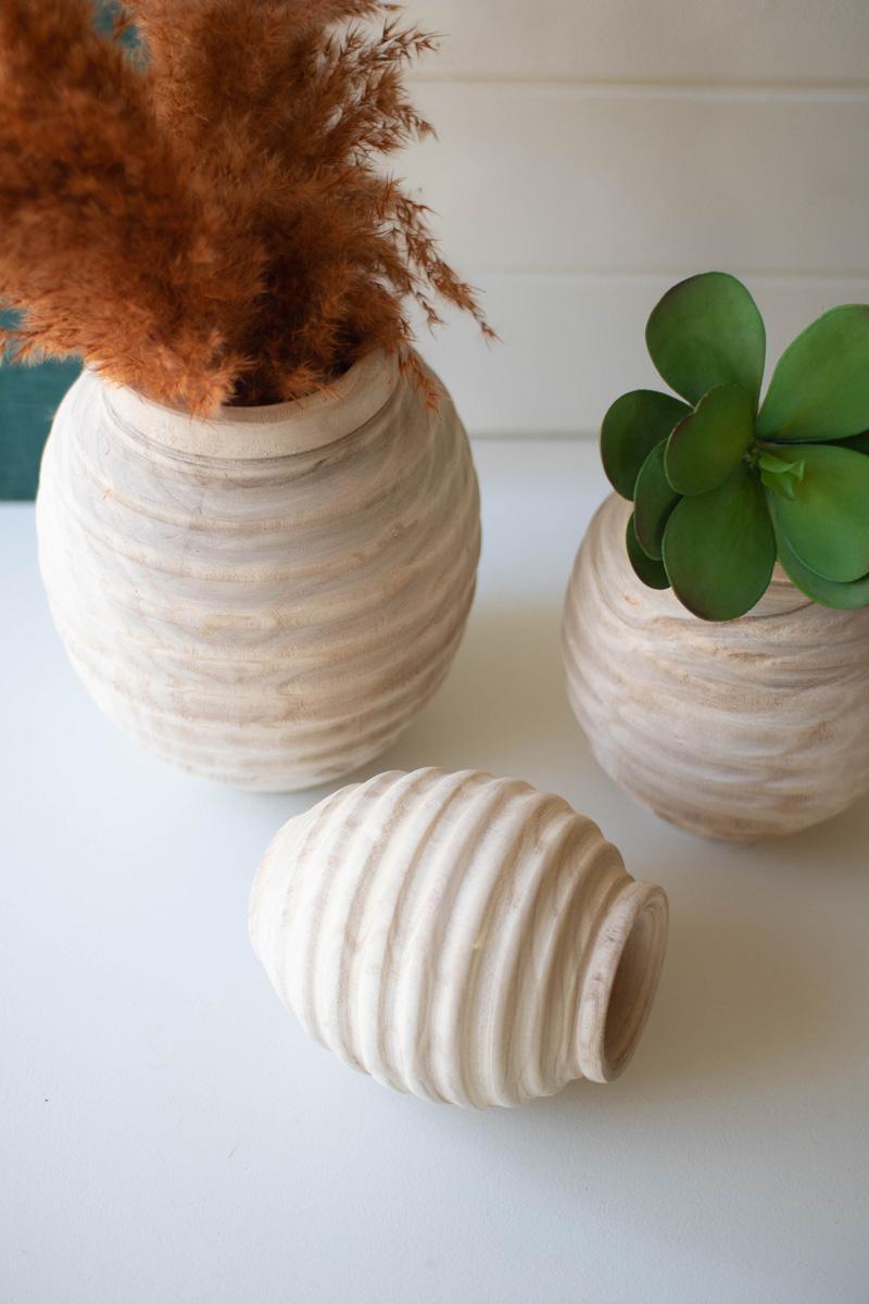 This set of three unfinished wood planters is an elegant neutral addition to any home decor. The sizes are as follows: small: 4.5"D, medium: 6.5"D, and large: 7.5"D. Separate them for multiple plants or tier them for a layered look.