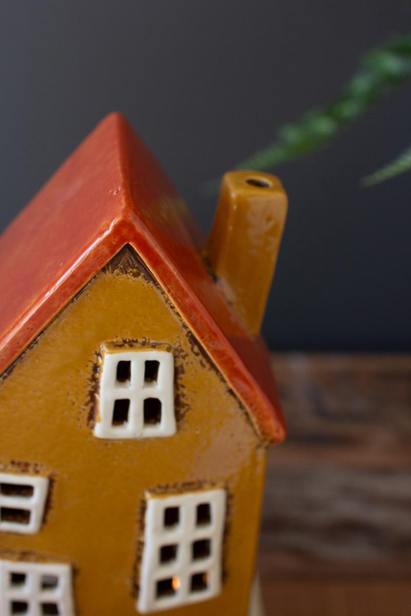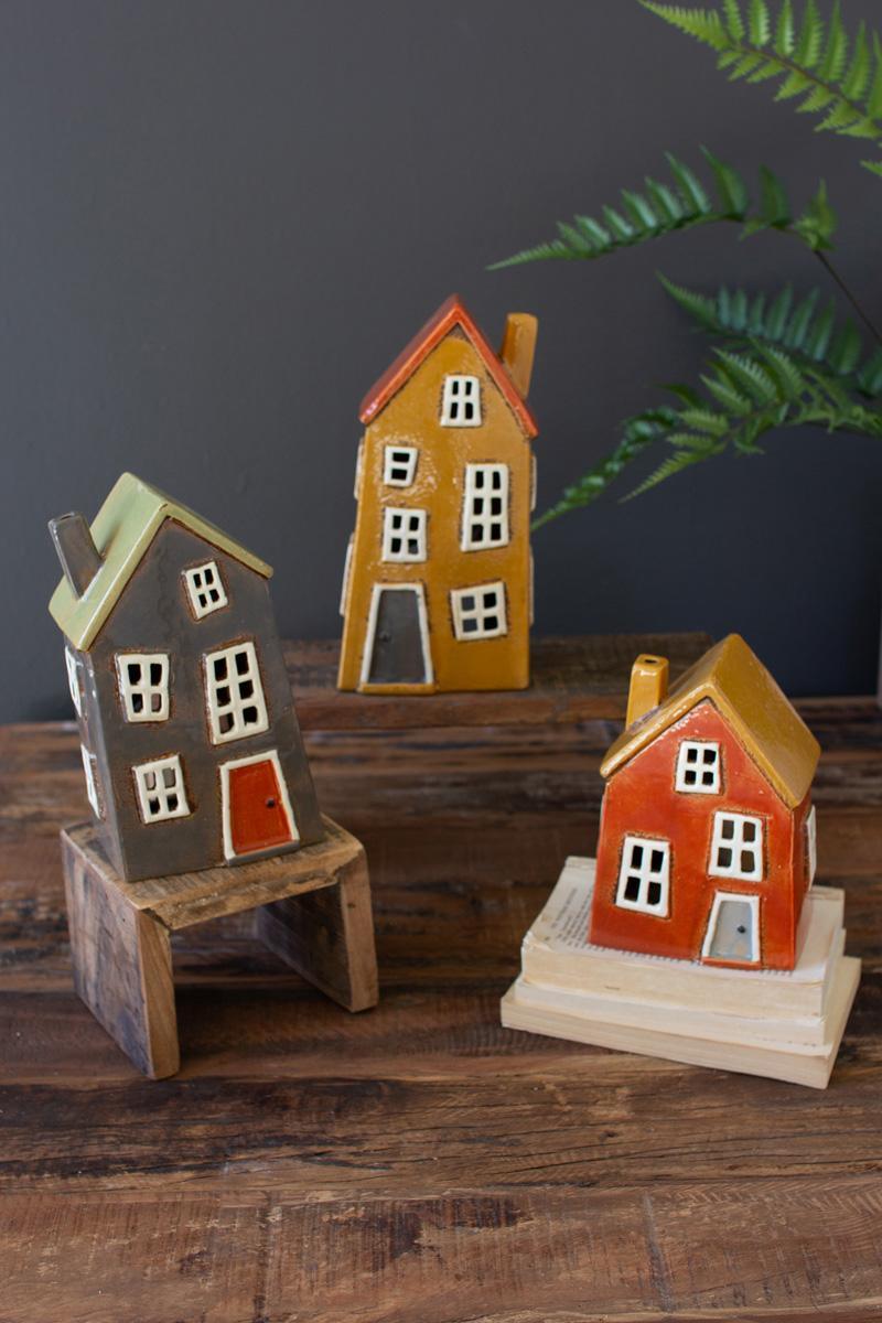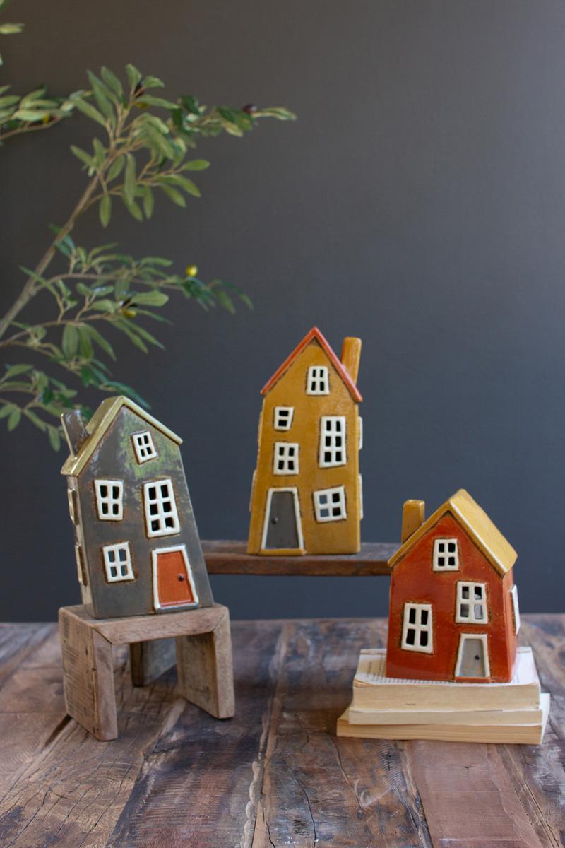 This set of three ceramic houses in green red and yellow make a somewhat wonky set. Use these for your holiday villages or year-round displays. Three different heights mean they can group or separate easily.