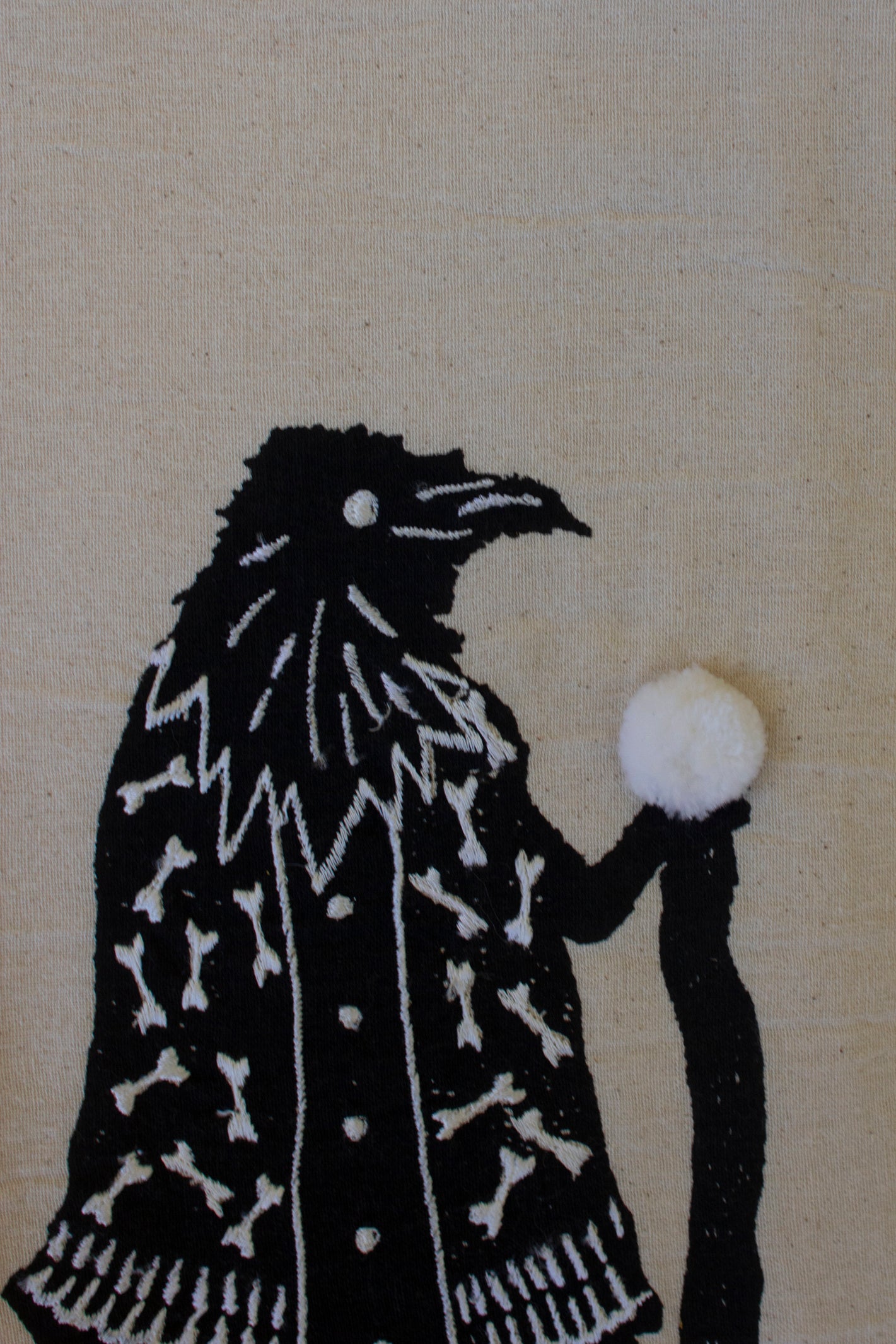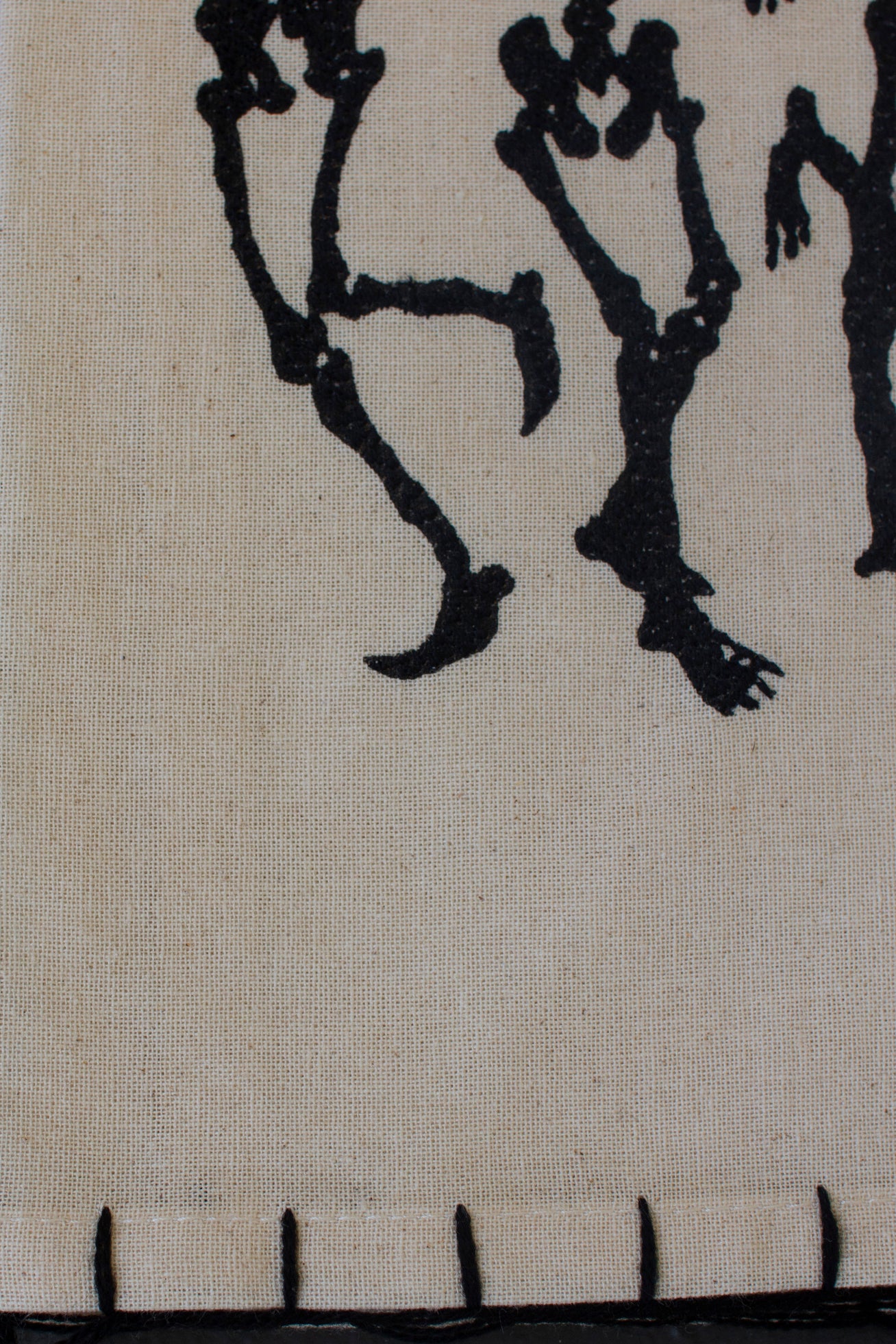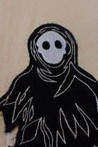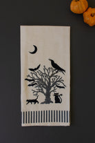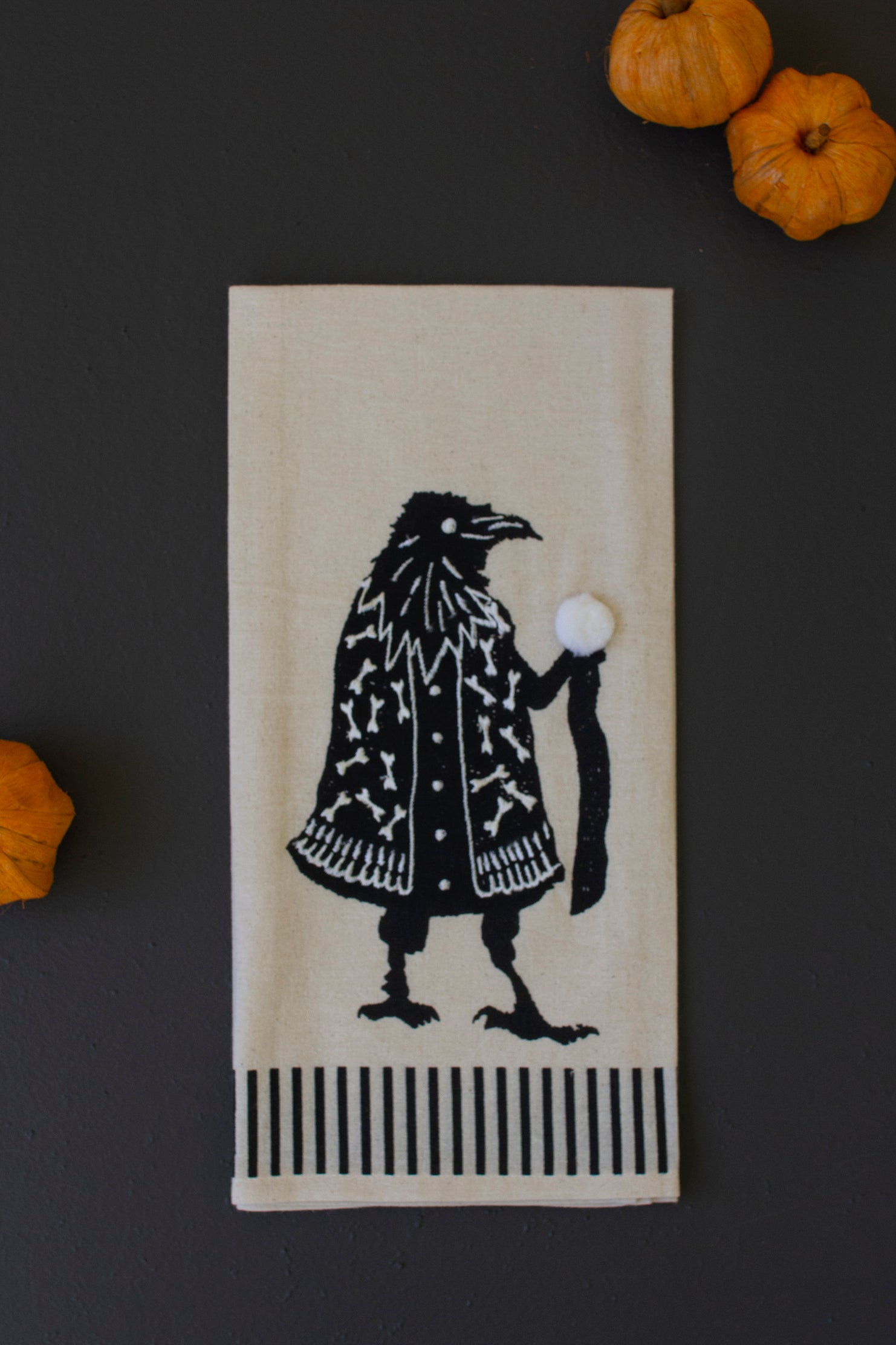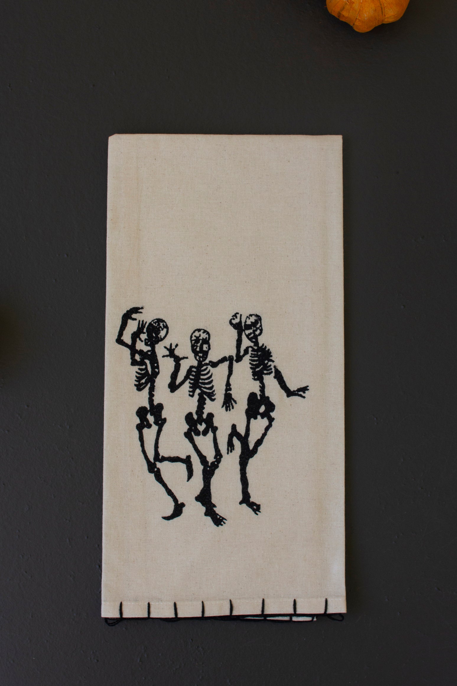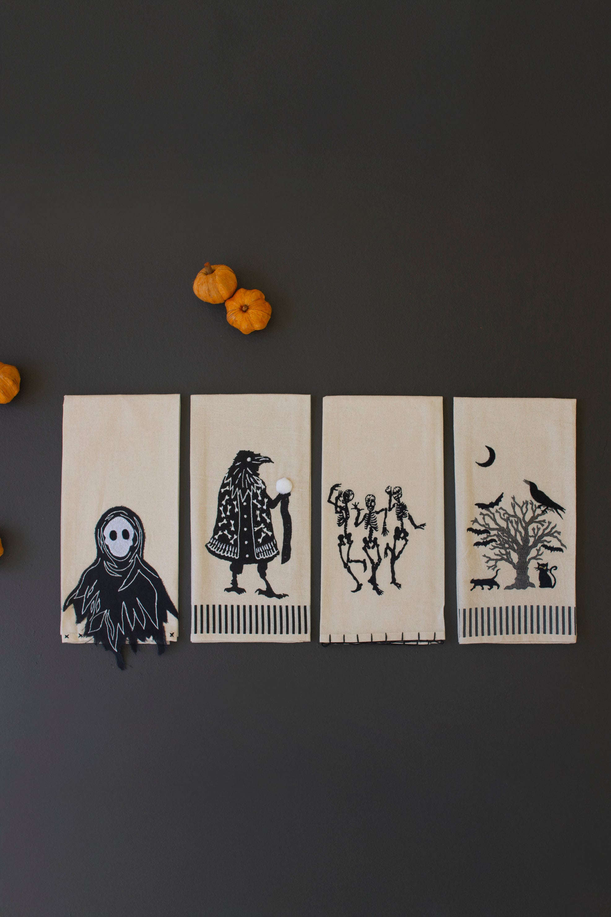 You'll love these Halloween towels. A Grim Reaper and dancing skeletons bedeck this set of four. Mix and match with other sets or plain black towels. Ghost: stitched border, fabric applique and quilted highlights. Blackbird: Painted with quilted details and raised embellishments. Skeletons: Embroidered with yarn stitched border and trim. Halloween scene: Embroidered