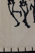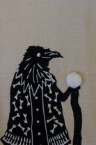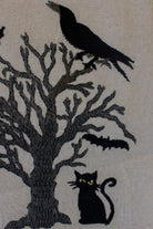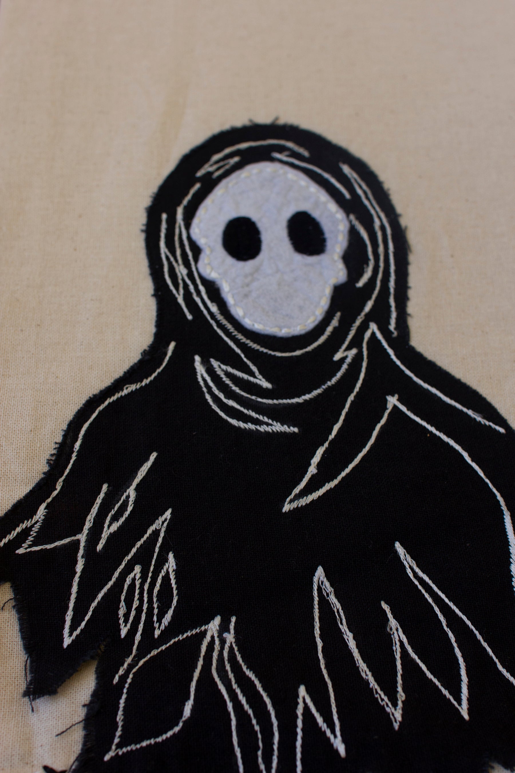 Ghost: stitched border, fabric applique and quilted highlights. Blackbird: Painted with quilted details and raised embellishments. Skeletons: Embroidered with yarn stitched border and trim. Halloween scene: Embroidered