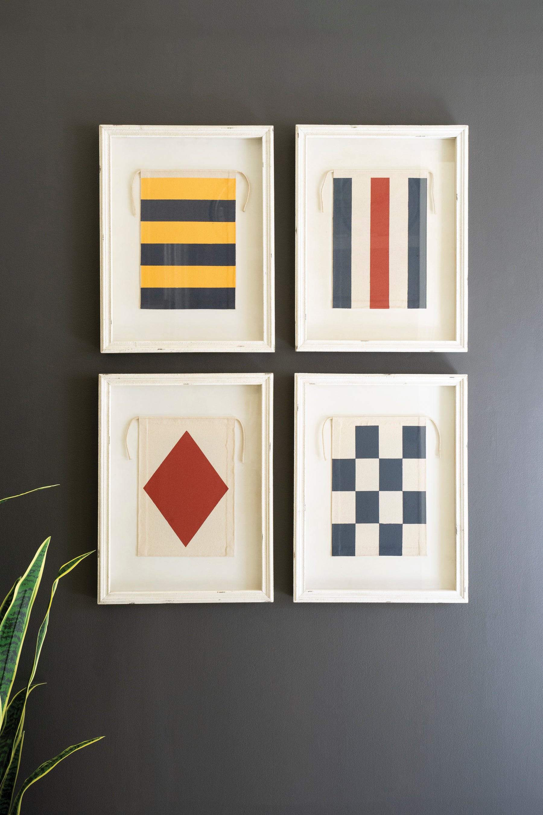 Break out the sailboats and seasides. This set of four framed nautical flags under glass can be hung in a square, vertical, or horizontal formation for an interesting set piece. Highlight a wall or overhang with this set of four. Two triangle hooks on each.