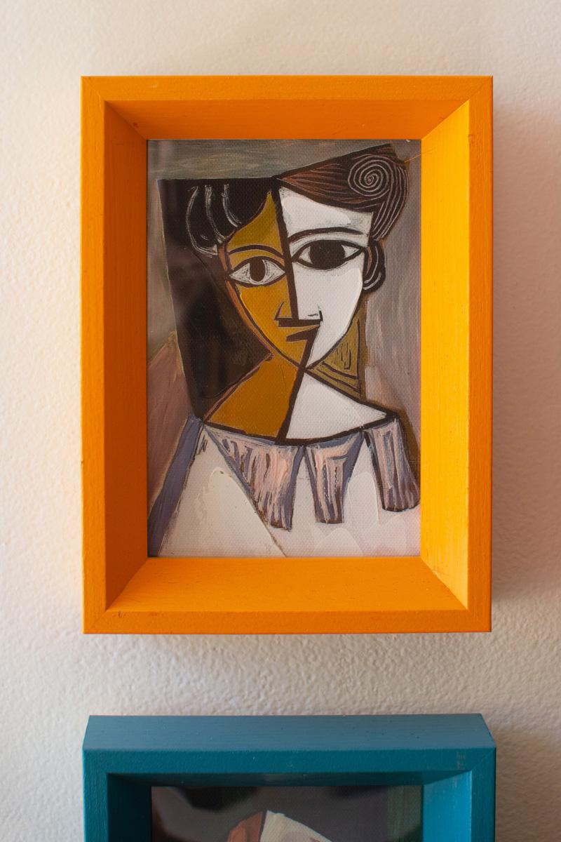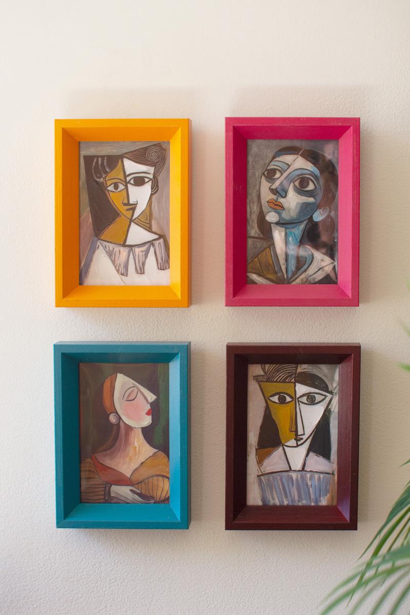 Art rooms and artists need this set of four framed Cubist paintings. Colorful frames in orange, red, blue, and purple highlight the intense style within. Use the set together on a gallery wall or split for effect. One sawtooth hanger each. Acrylic cover.