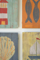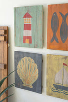 Hang this hand-painted set of four together or split the set. Made of painted wood, this coastal wall art set features a lighthouse, fish, scallop, and a sailboat on colorful backgrounds. This set is perfect for coastal cabins or a beachy bathroom. One wire hanger each. Handcrafted by skilled artisans in Haiti.
