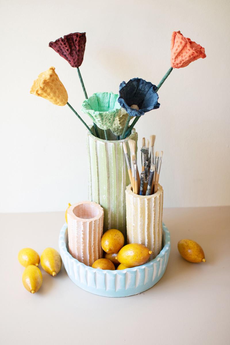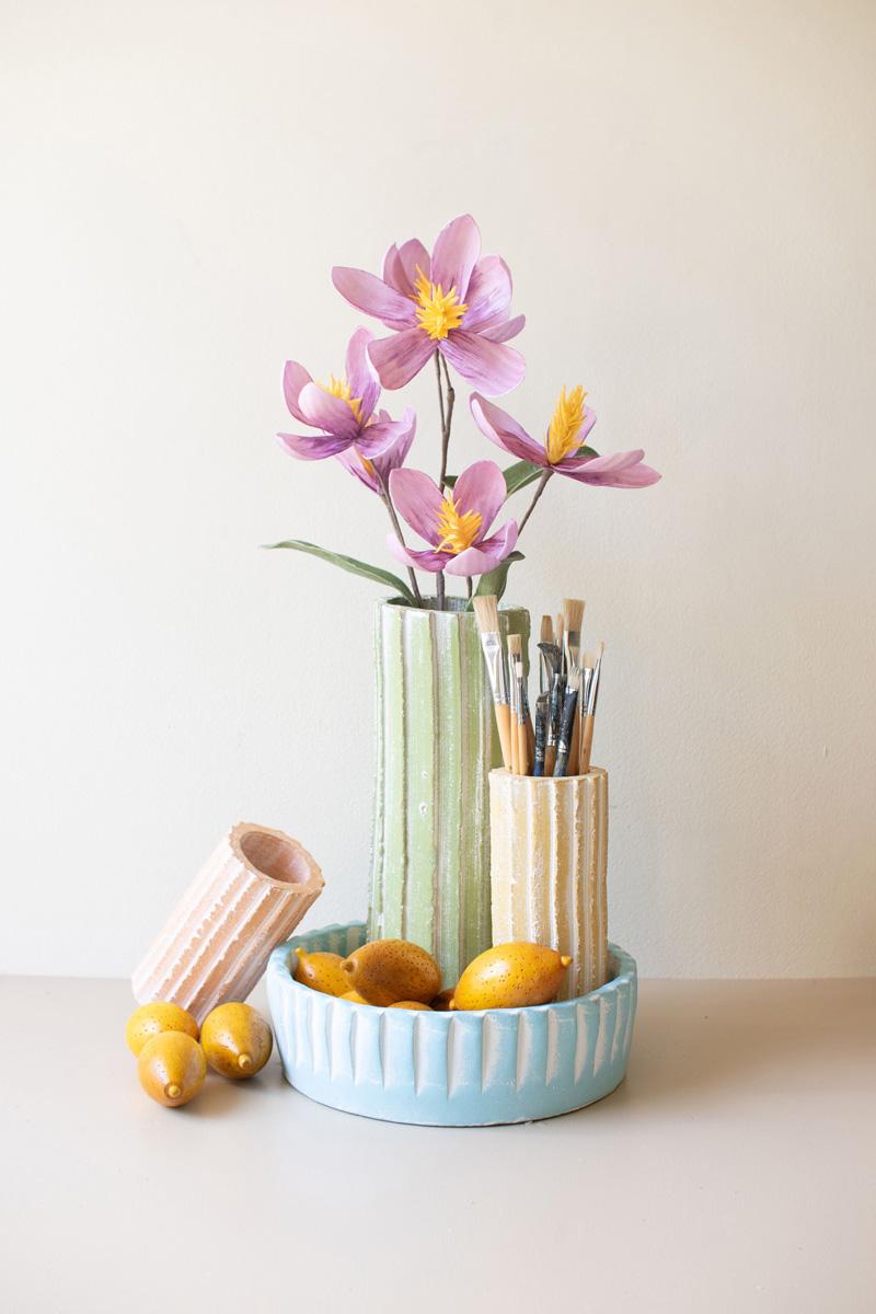 Set Of Four Ribbeld Clay Cylinder Vases & Bowl One Each