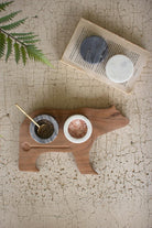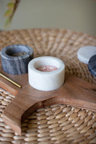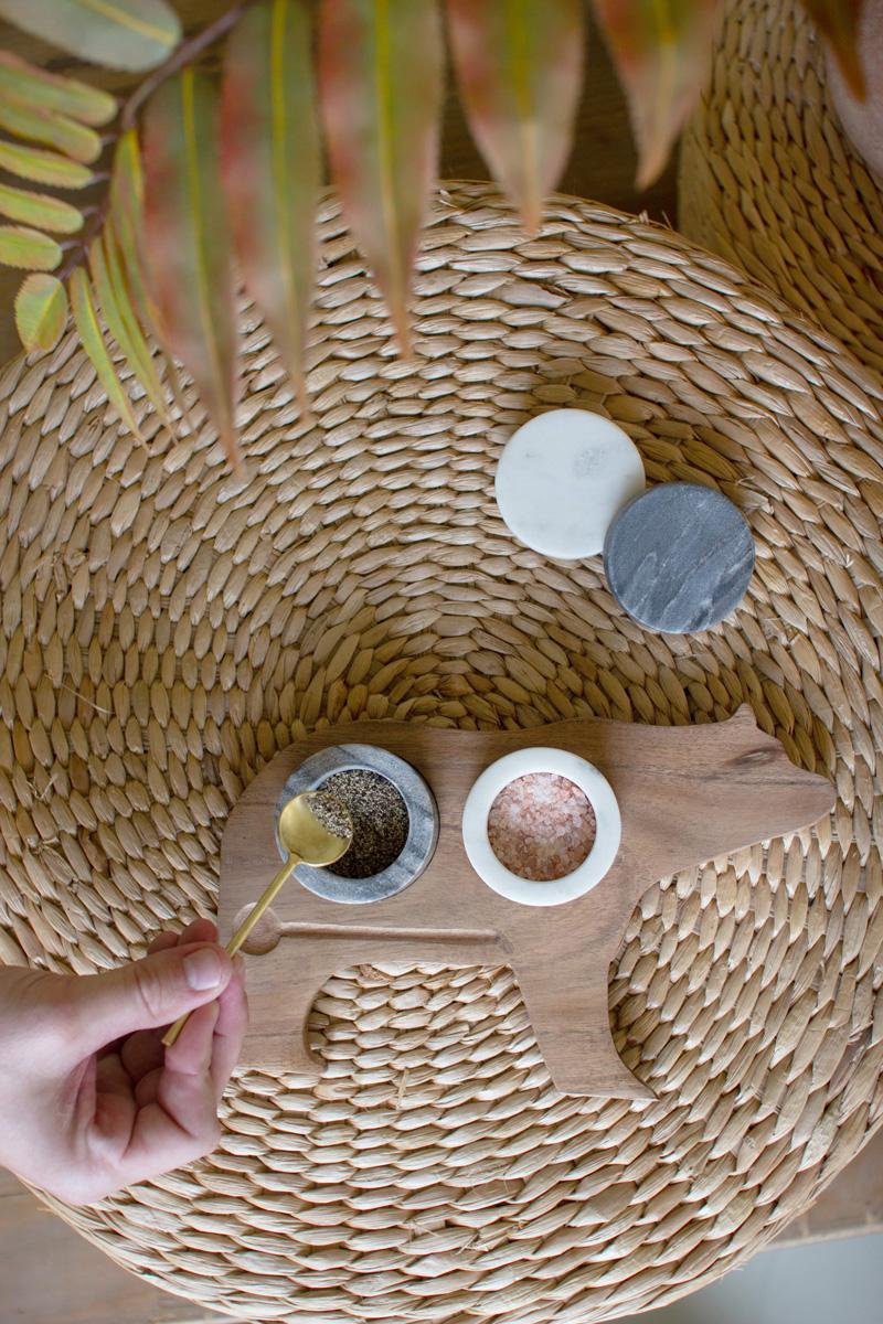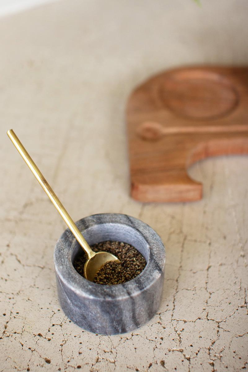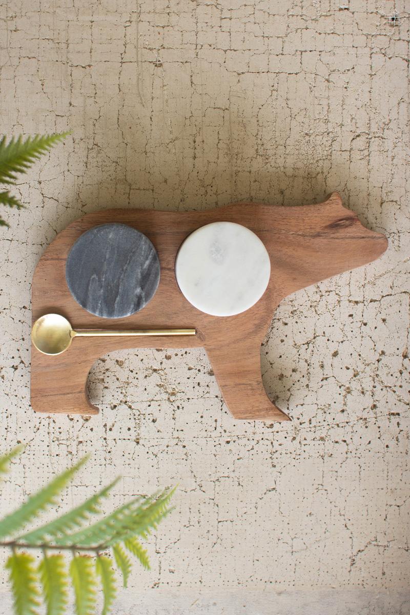 - Set includes 4 pieces. 2 marble salt cellars with lids, 1 metal spoon, and 1 wooden bear tray