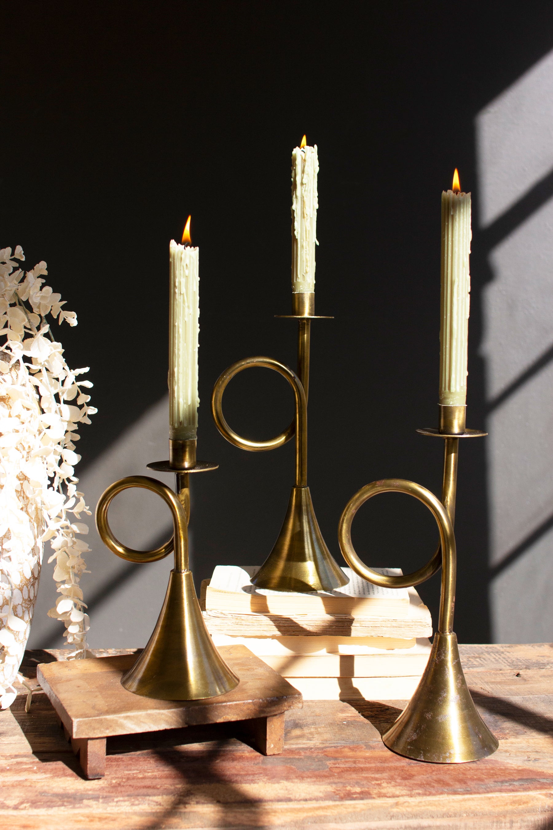This set of taper candle holders shaped like old-fashioned trumpets hits the right note at the holidays. Use them at Christmas to announce advent or year-round in a music room or dining area. Make a yuletide mantle arrangement with this set of three.