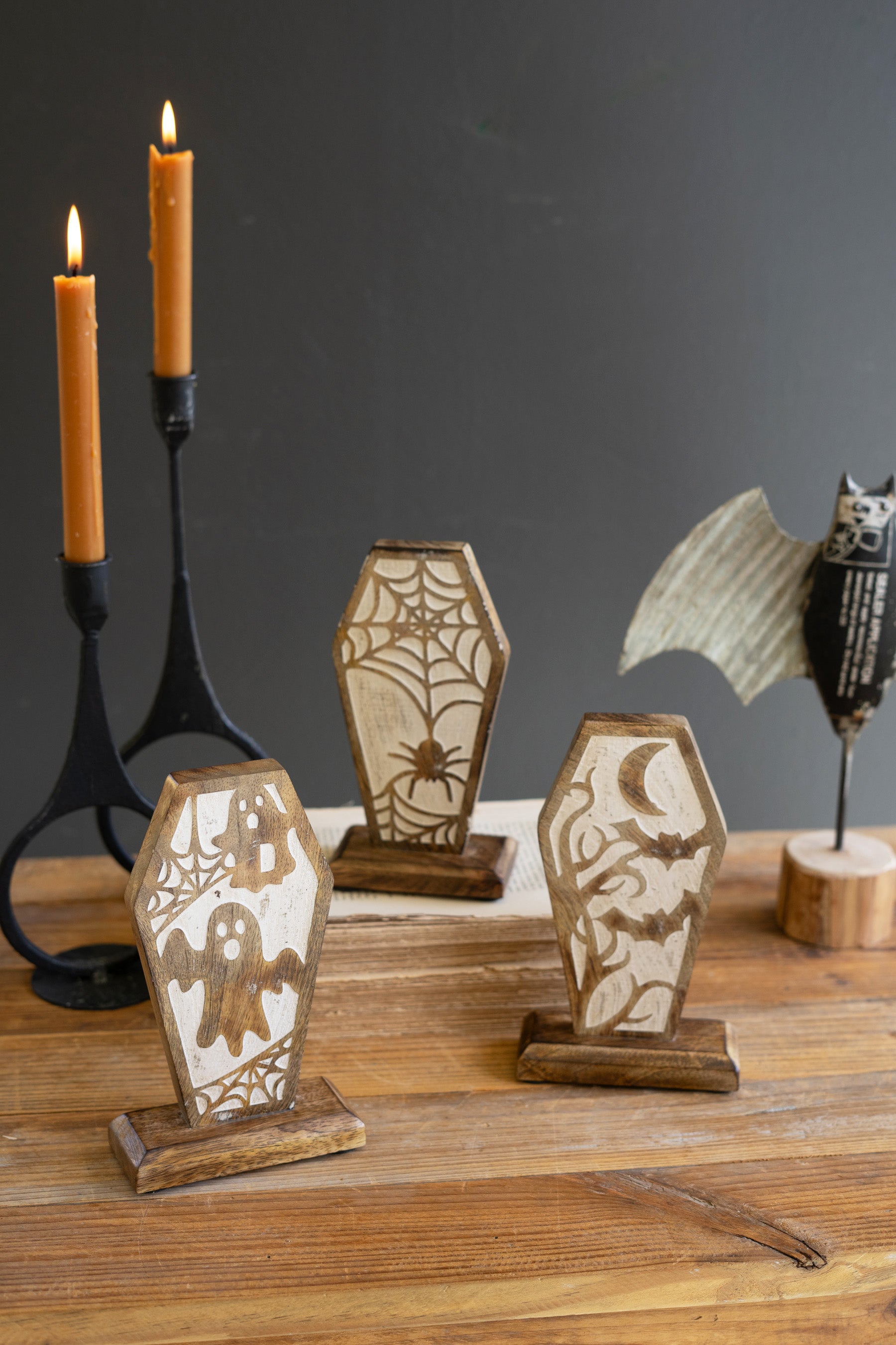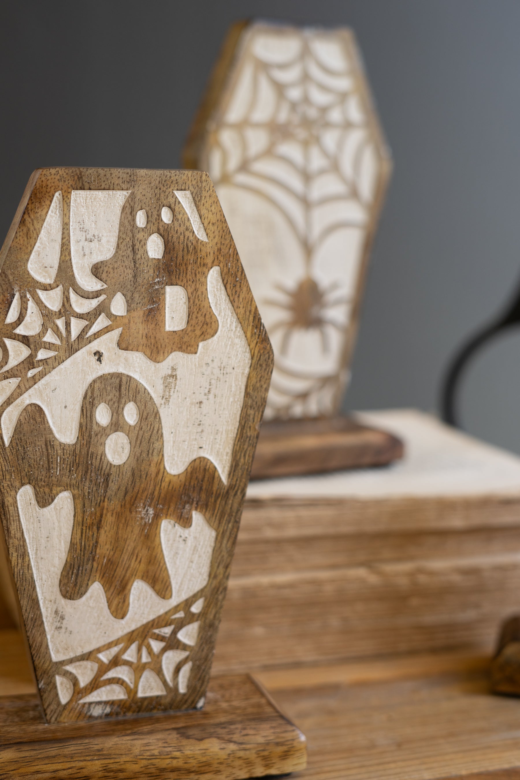 Set Of Three Carved Wooden Halloween Coffin Scenes