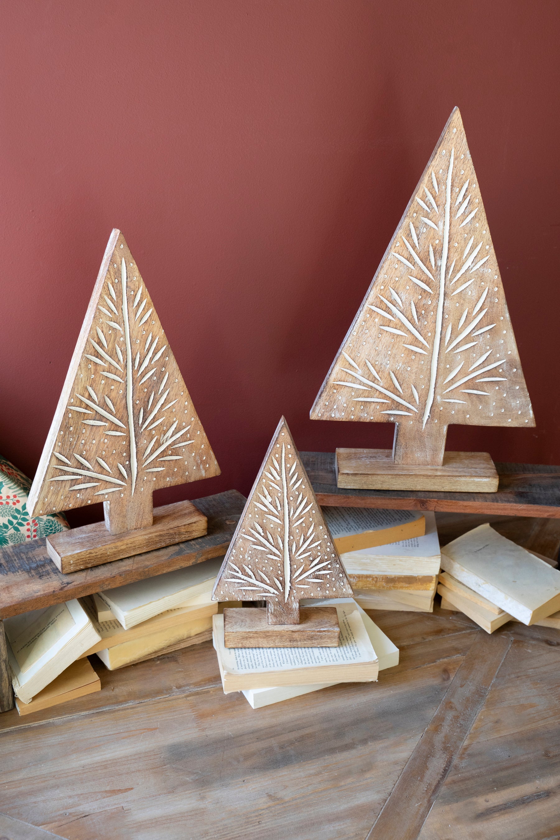 This set of three carved wooden Christmas trees on stands represents simple beauty. Populate your holiday village with these trees. Gift to anyone who needs some cheer.