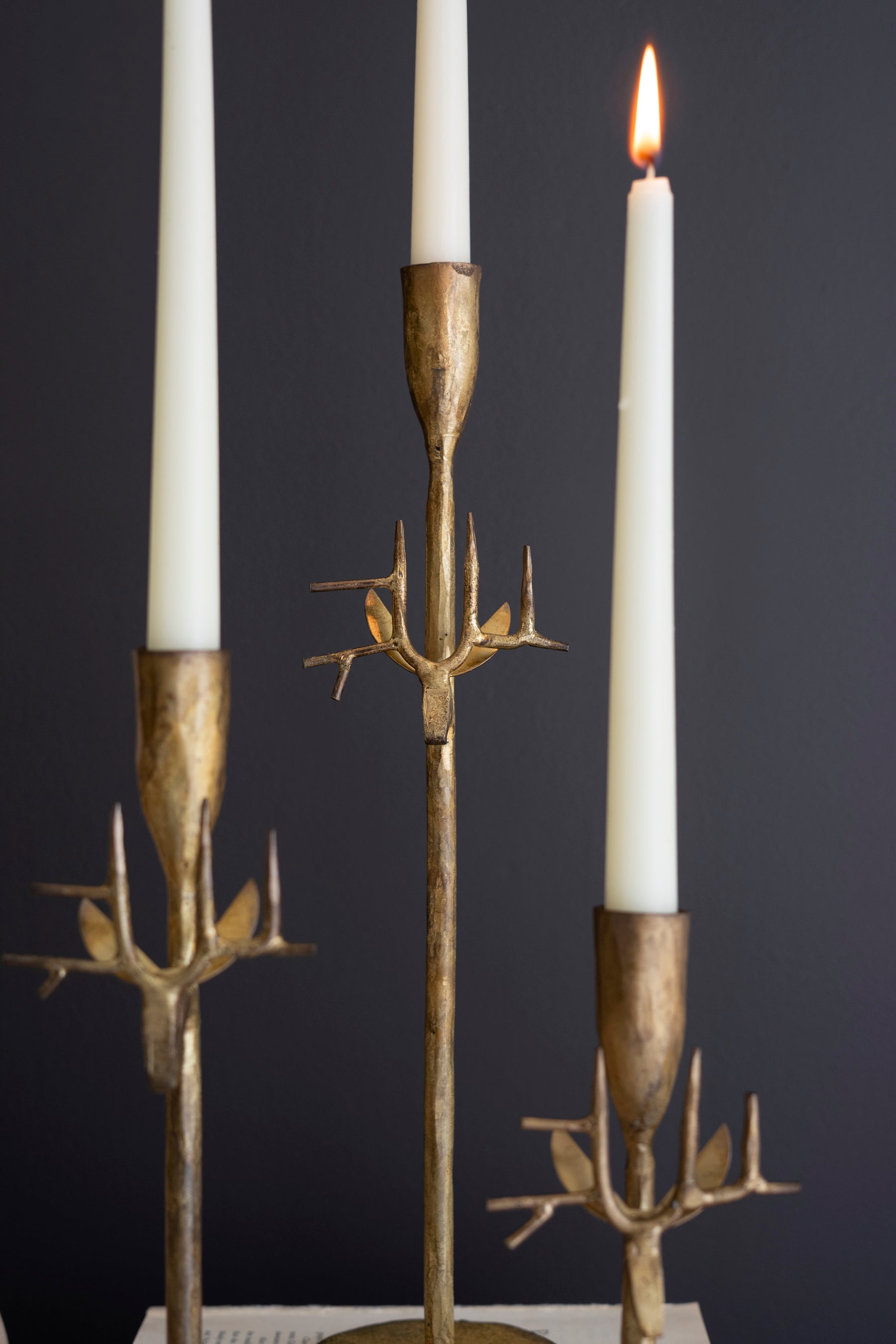 Make room for this set of three deer antler taper holders. Use them for the holiday or the hunting lodge. With forged iron construction and an antique gold finish, this set is made in India.