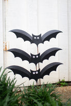 Three painted bat stakes are winging to your home. This trio is set to haunt your yard or potted plants this Halloween. Stack them or spread them out to create your fright night fresco. One sided.