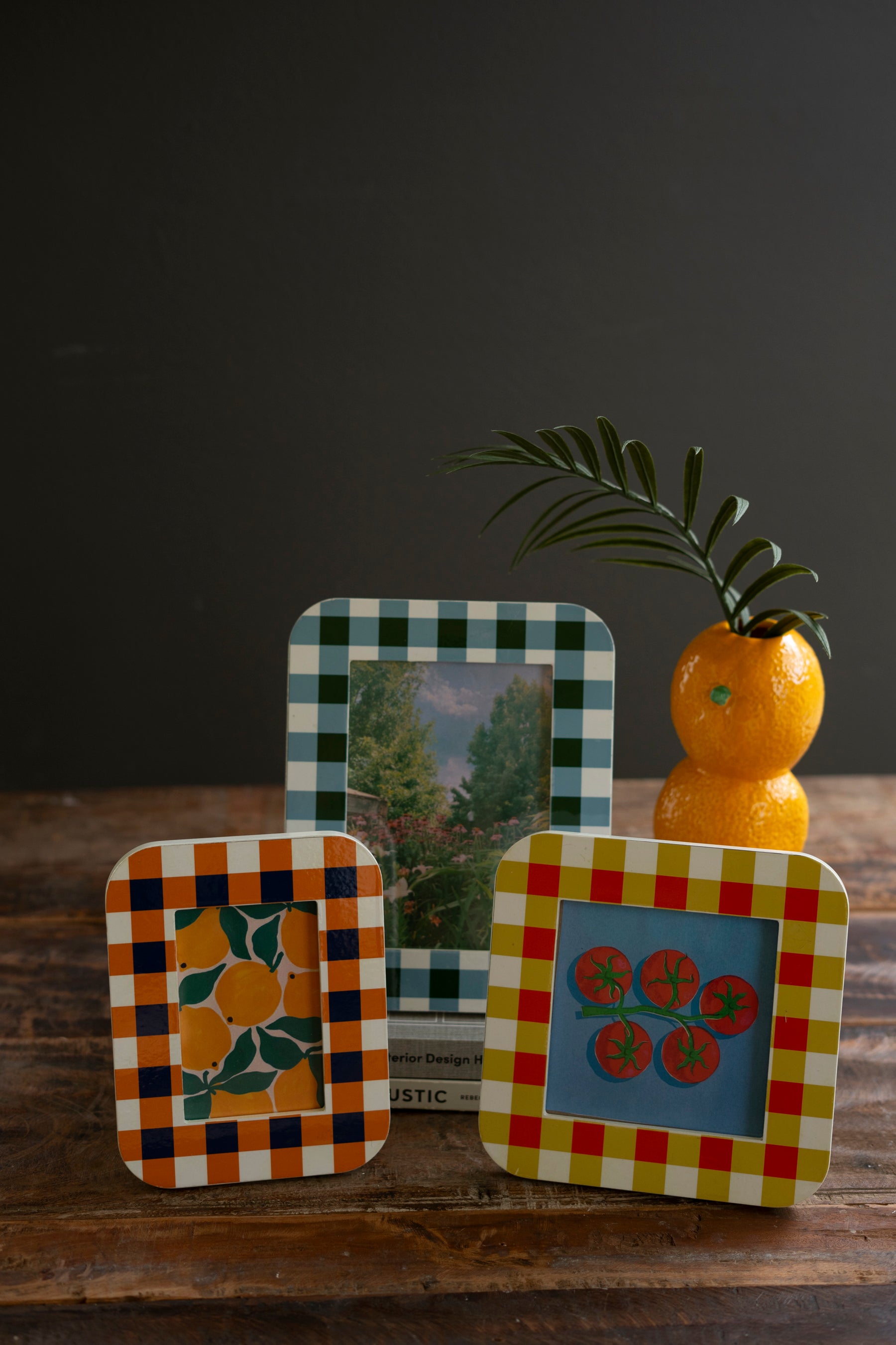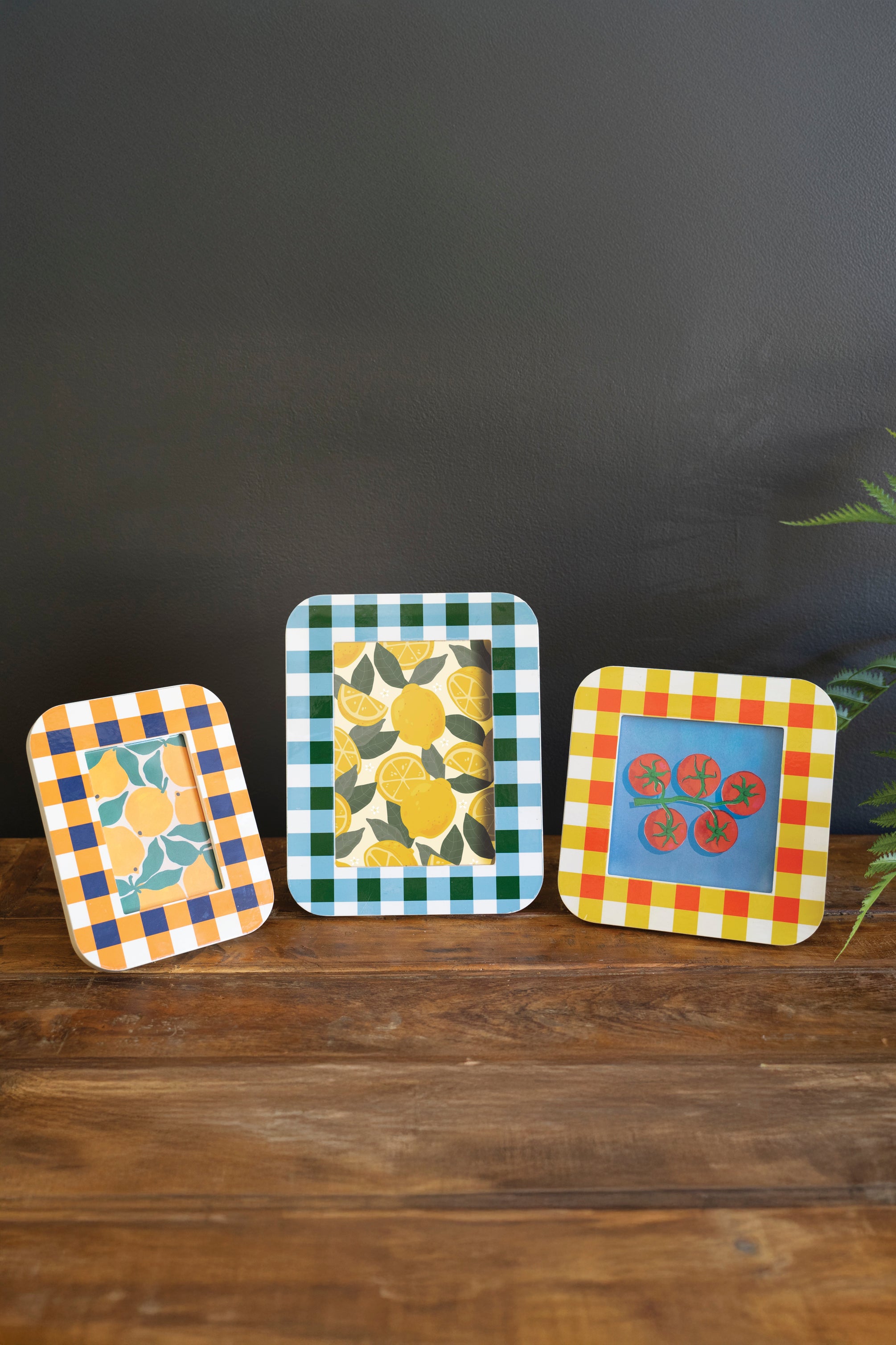 Display loved ones or favorite prints in this set of three wood photo frames. Each one is characterized by bright colors and plaid patterns. Split the set or use them all together for a bright spot anywhere. Kickstand support. No hangers. Portrait only.