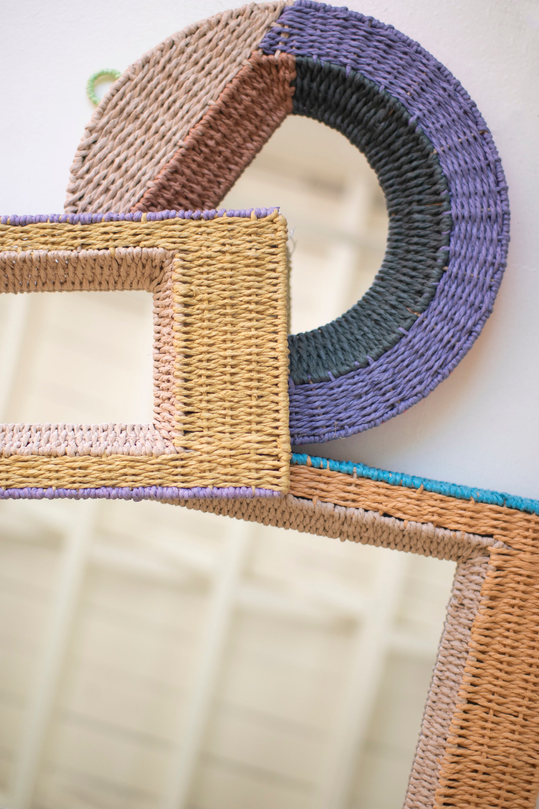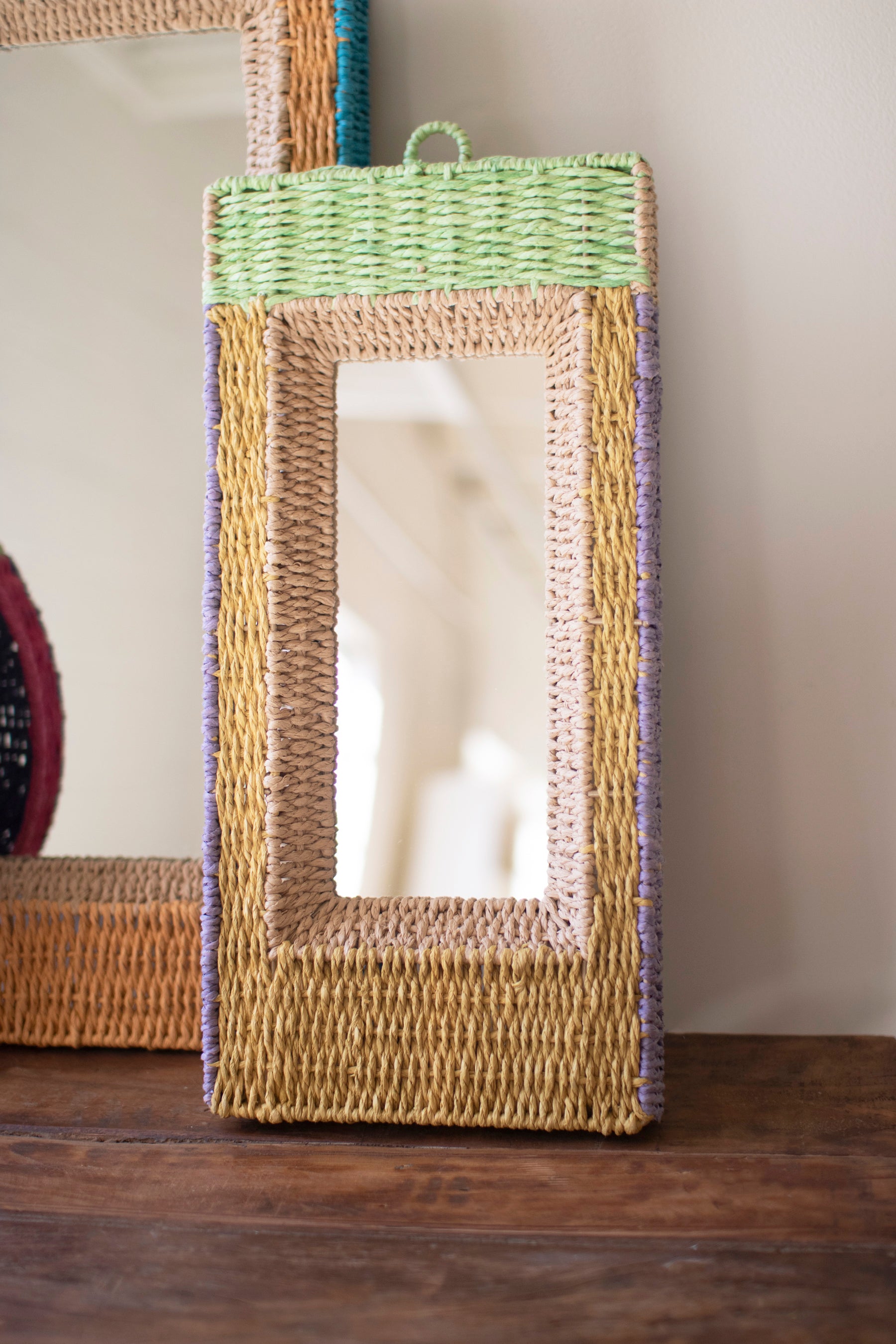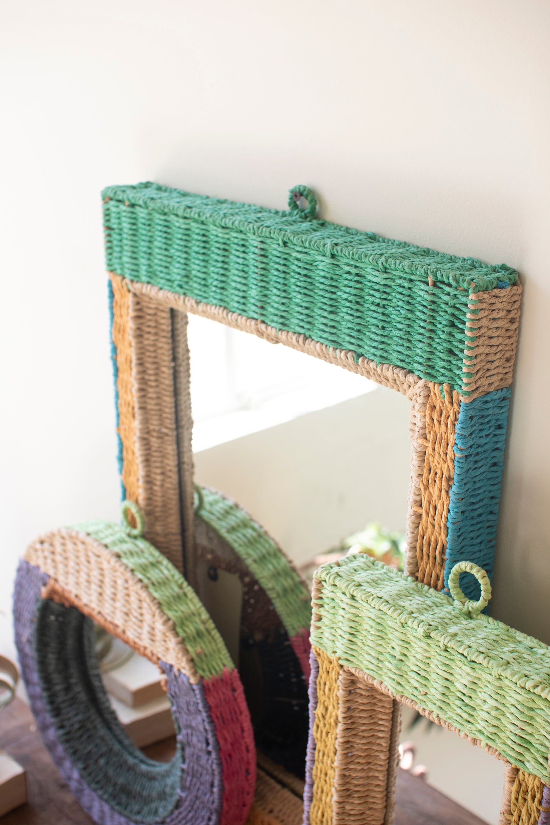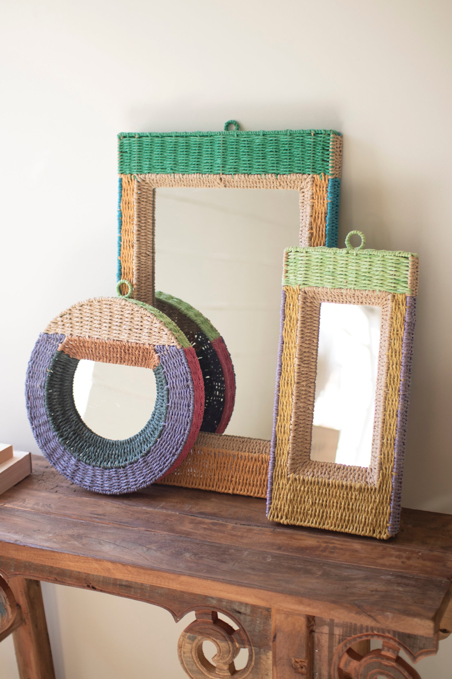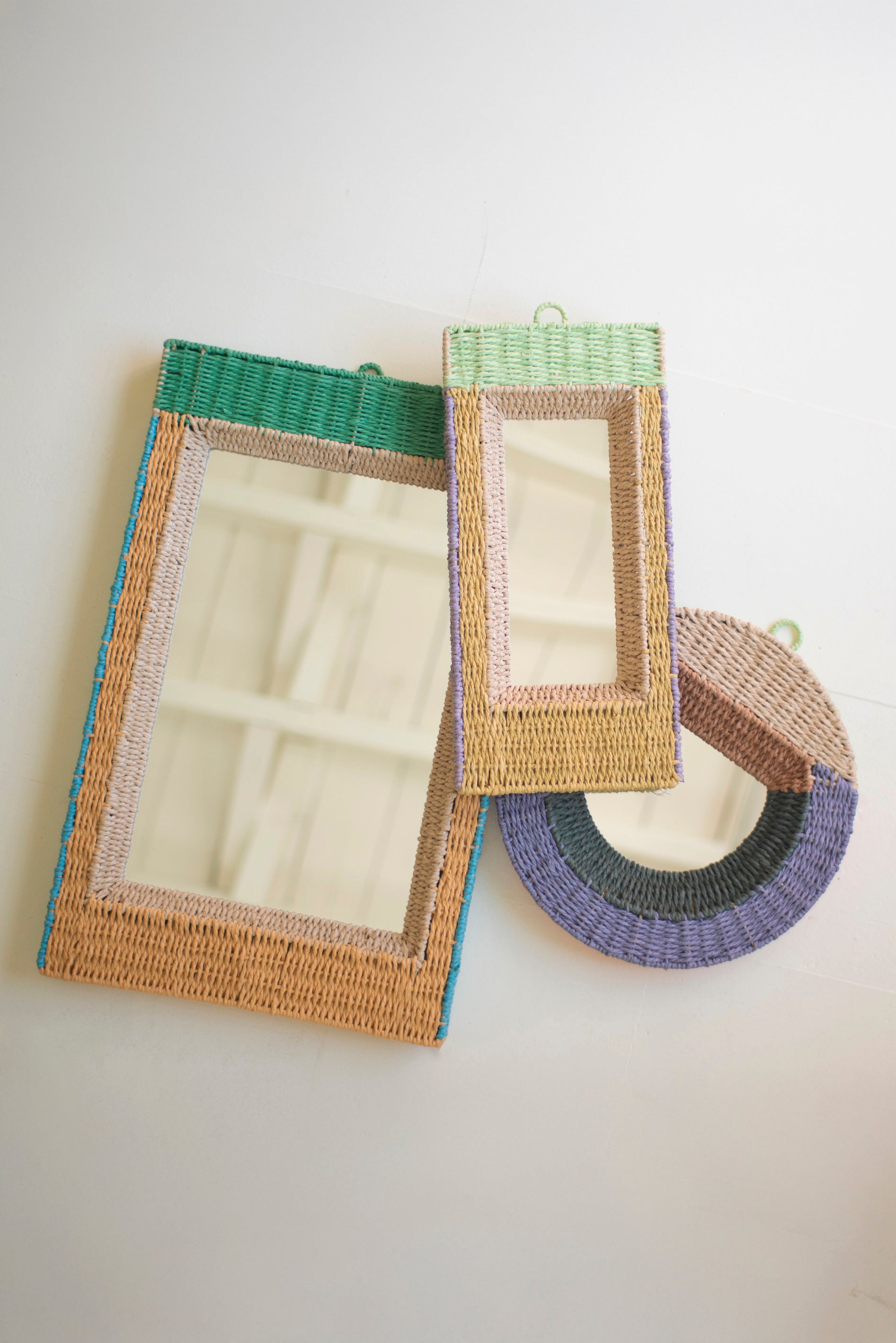 You'll want to snag the set of three recycled paper mirrors. They come in three sizes and shapes: large square, medium rectangle, and small circle. Group or separate this colorful trio. Loop hanger.