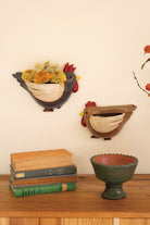 These wall planters are all cluck! This set of two chicken wall planters is made of glazed ceramic and distressed. Greet guests with fresh blooms or hang these in the kitchen for year-round storage. 2 keyhole hangers.