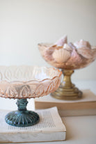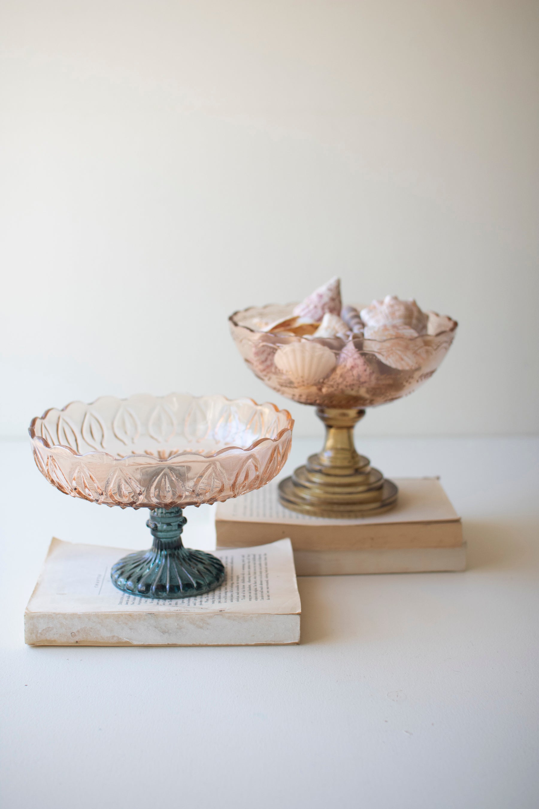 This dainty set of two glass compotes comes with one of each design. Made in India, they serve or display. Split the set or gift one to the newlyweds.