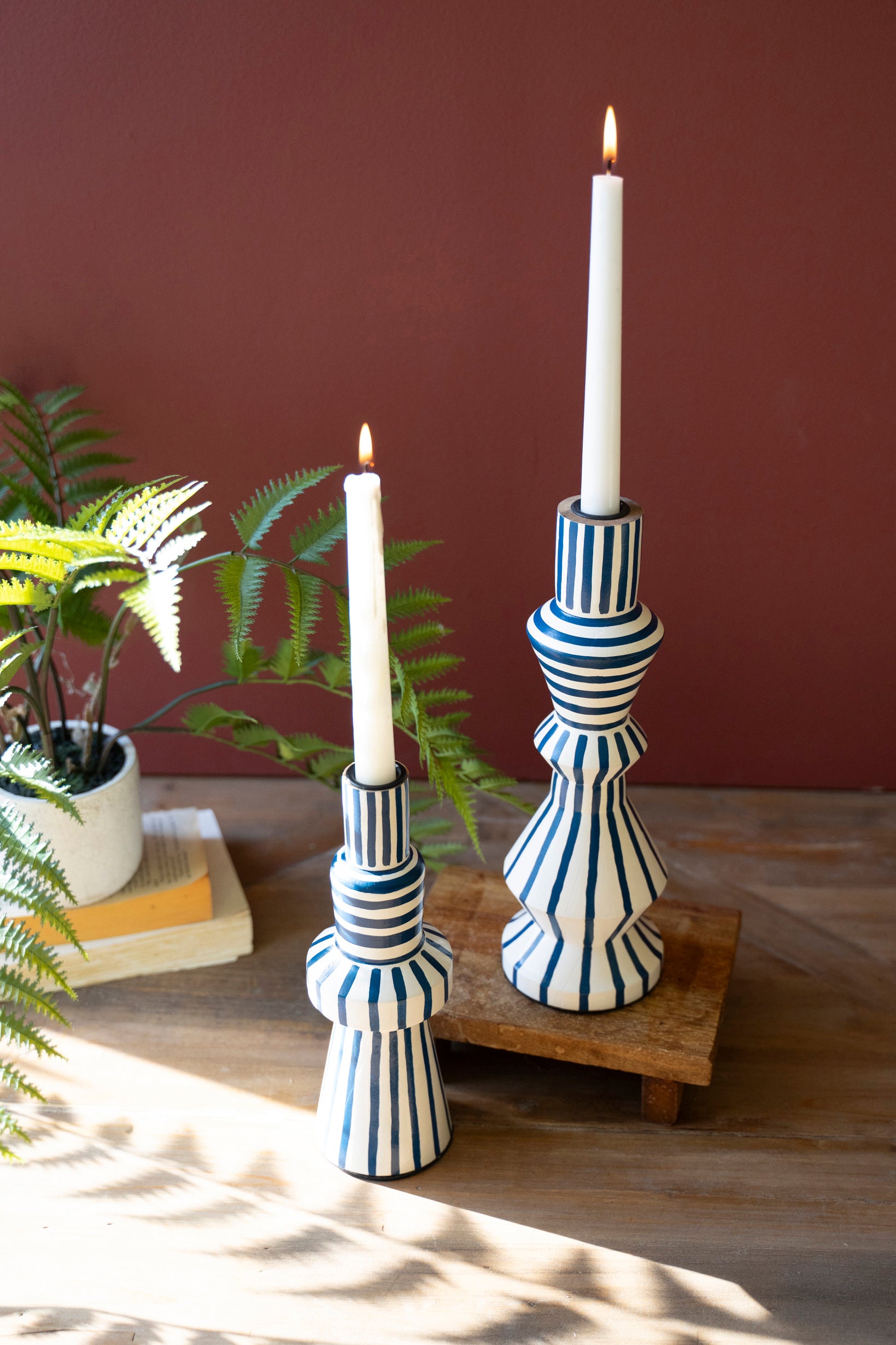 This set of two hand painted wooden taper candle holder is white with blue tripes. Pair it with the green set to mix and match. The set holds one taper each. Felt bottom