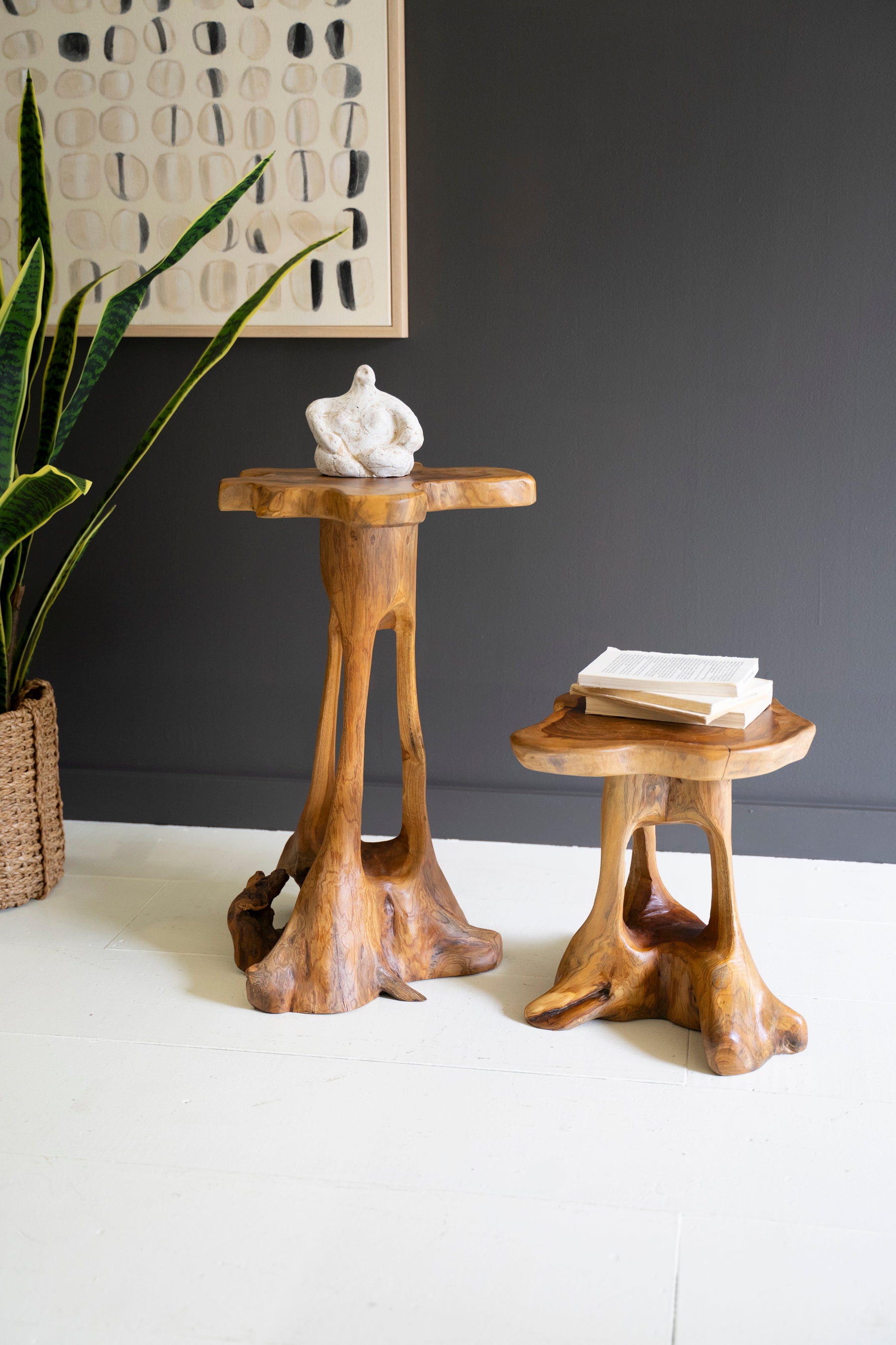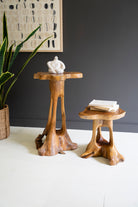 Guest room decor is a snap with these stools. This set of two organic teakwood stools is made in Indonesia. Use them for seating or surface area for goodies year-round.