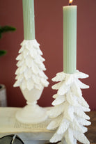 This set of two polyresin Christmas tree candle holders holds one candle each. White Christmas tree shapes go with your village or green tree collection. Split the set or use them together.
