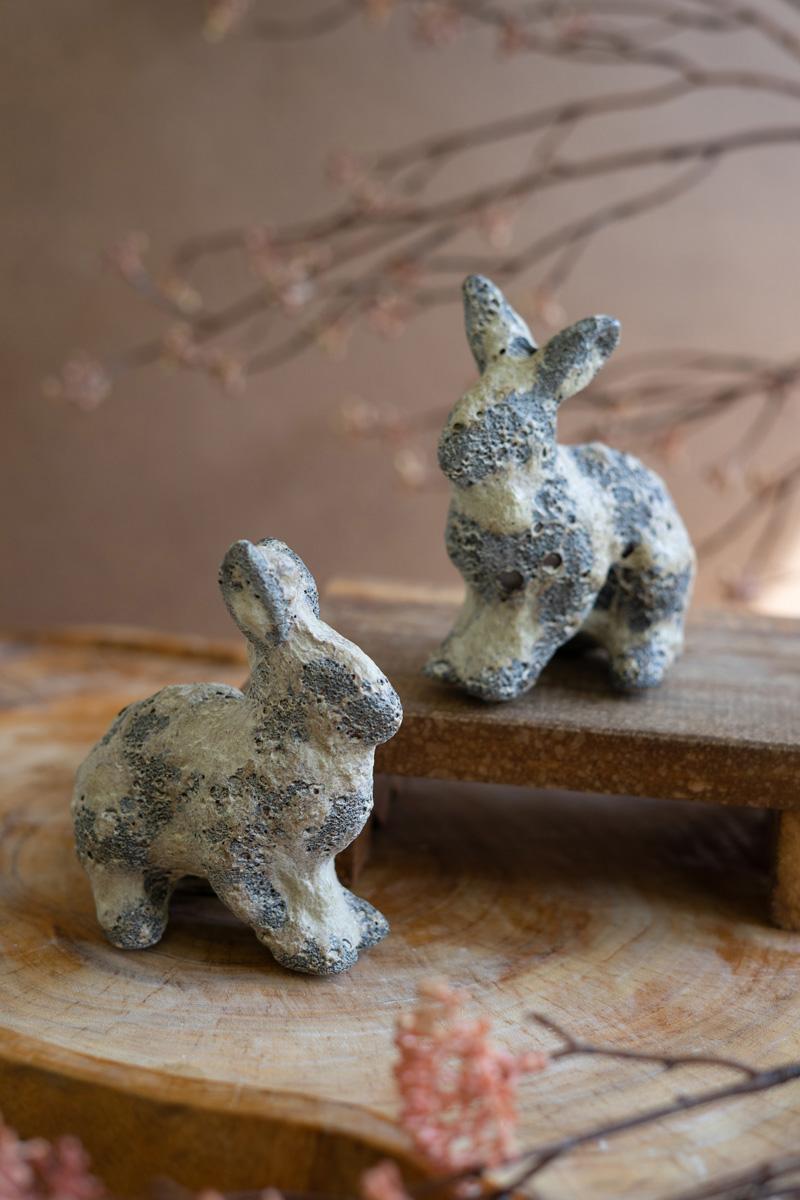 These rustic rabbits are made of distressed ceramic. The set of two bunnies makes a great gift, split or as a set. Put them in your garden area or enjoy them on a shelf. Rubber feet.