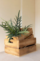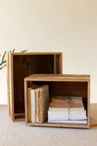 Store your vinyl, postcards, or extras in this set of two slatted wooden crates in natural. Wherever you need a bin these stylish crates suit. One is slightly larger than the other.